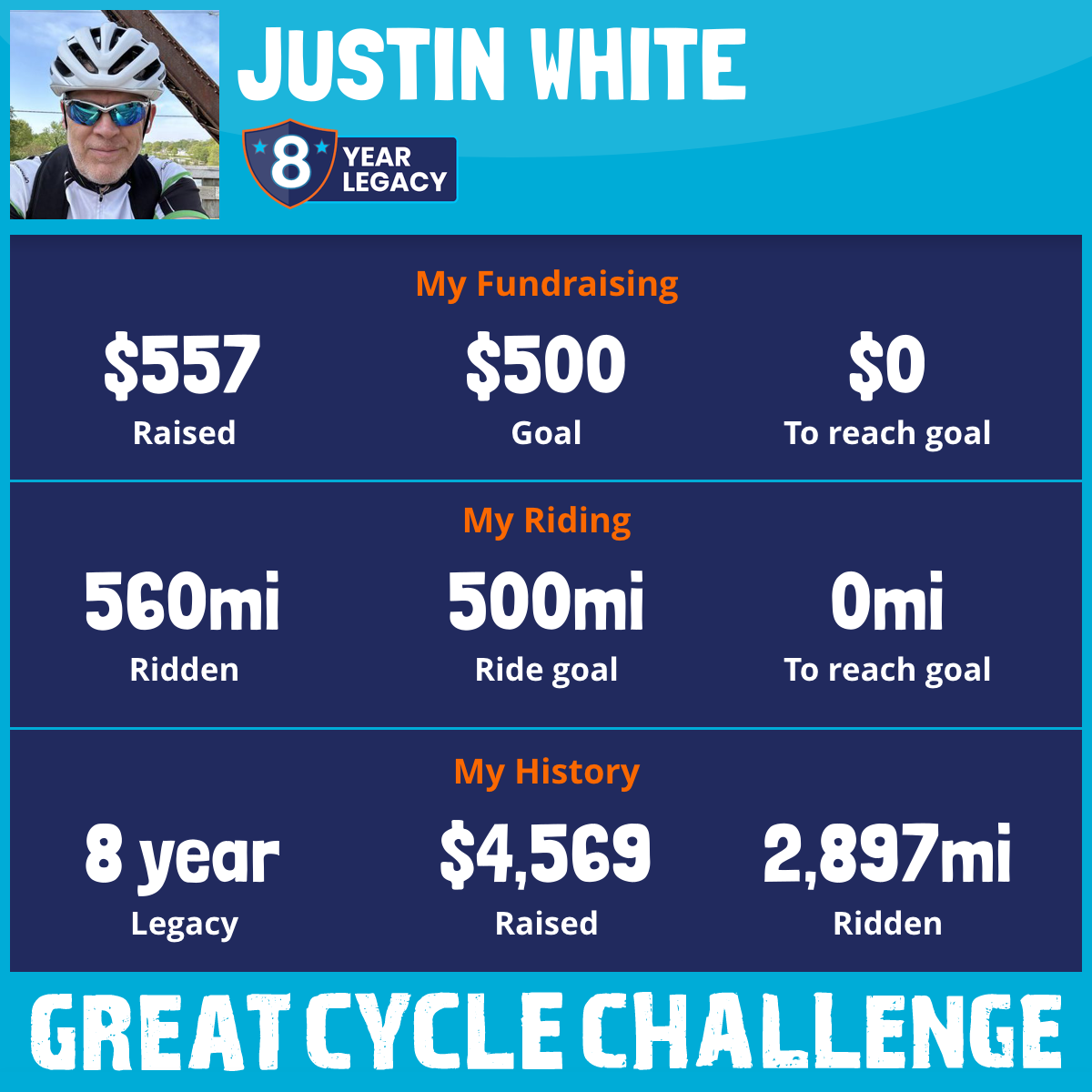 Dad, I am riding to reach my goal in your honor. You are doing everything you can to fight this deadly disease. With my efforts to raise money, I hope to give cancer survivors like you a fighting chance. Your son, Justin