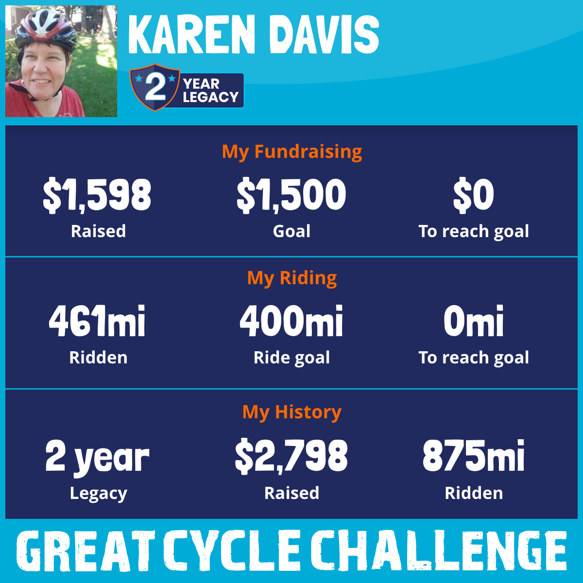 I just increased my original goals. I'm committed to 400 miles. Help me raise $1500!