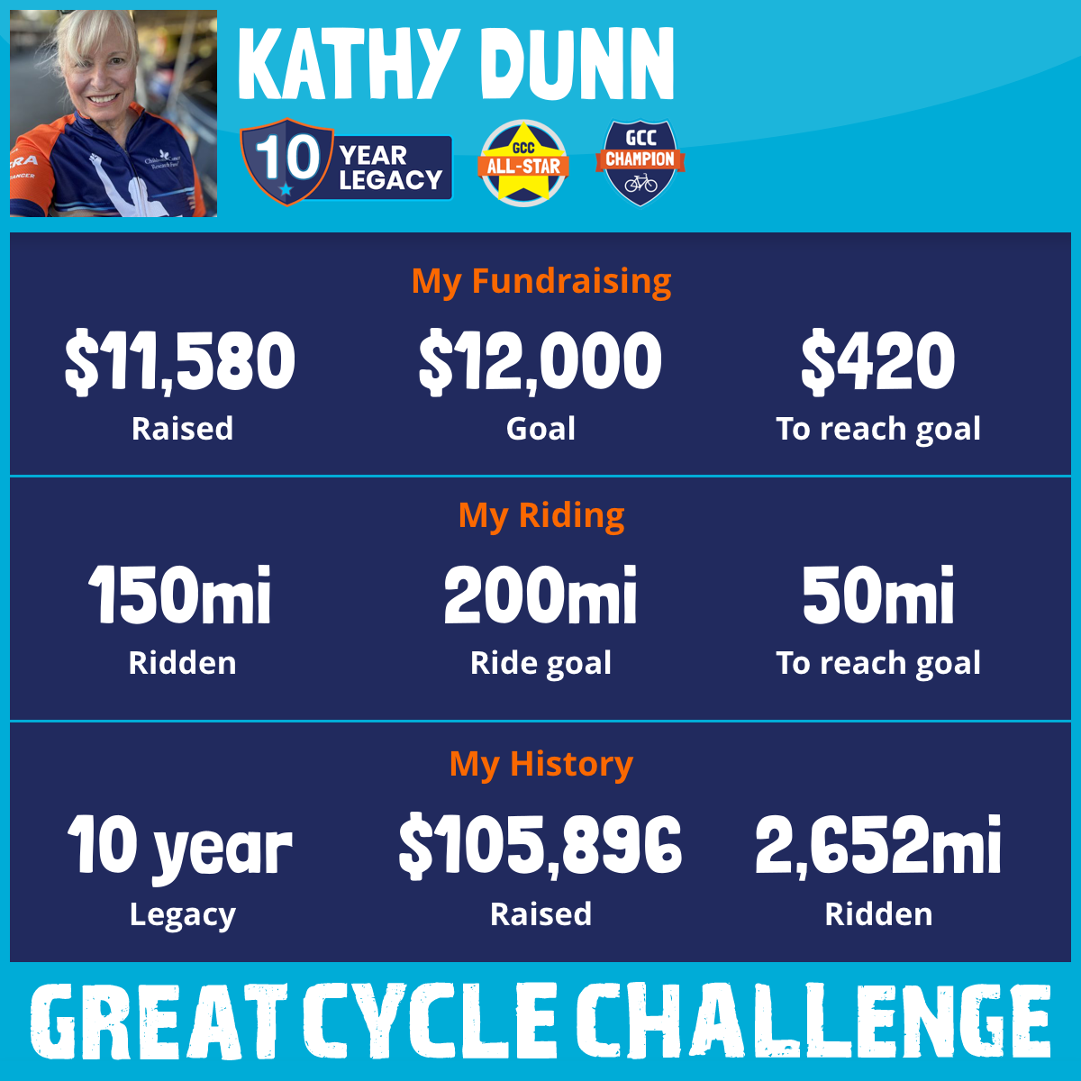 I am riding for all the sweet children impacted by cancer and for my 2 sisters who I lost to cancer. Maybe if we can make progress with childhood cancer research it will lead to a cure for all cancer. I am a survivor myself. My plan is to continue to find ways to get the word out about this awesome organization and help other riders grow. Maybe in a few years I will hit $100,000 my ultimate goal to make the best impact in research I can