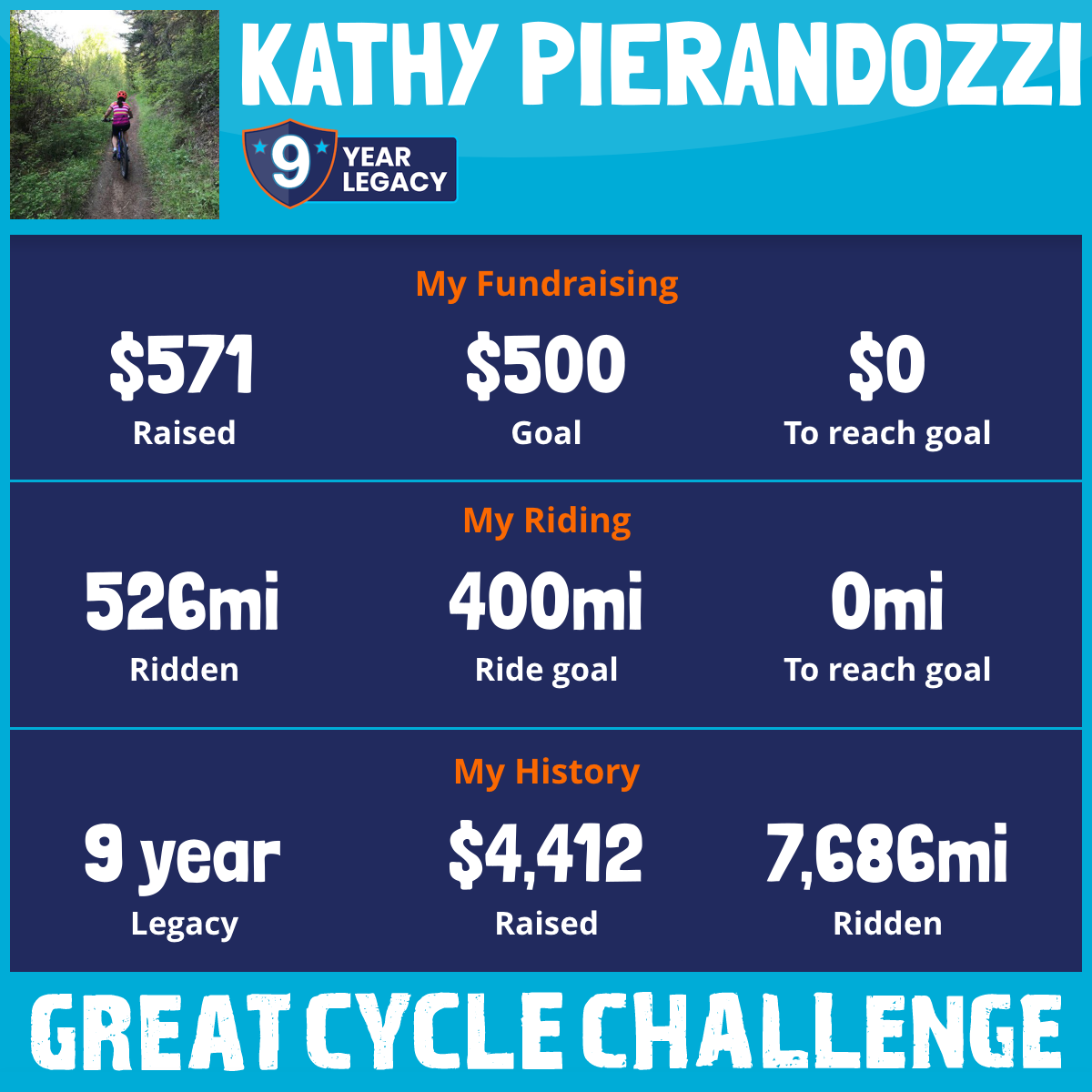 I am riding 400 mi for my friend, Carla Pierandozzi, Darla Bowley, Susan Newstat David Everingham. Please sponsor me and support my challenge to fight kids' cancer and save little lives.