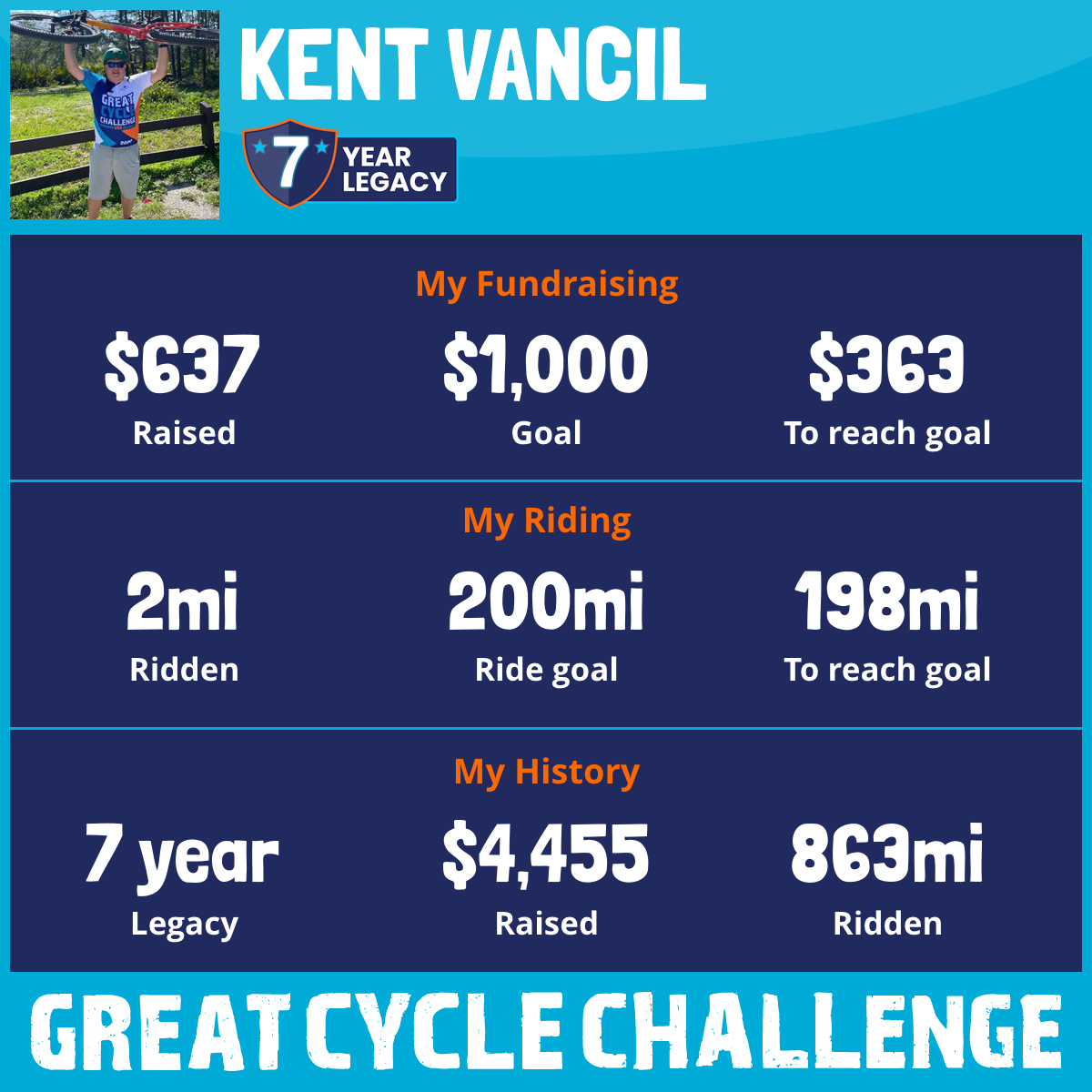15 Jul 2025Right now I’m riding to get in shape for the ride coming up. I’m also using this time to raise awareness and funds to reach my goal. Every year I set my own goal high enough to get a jersey. I set it double that number to push myself and to let others give throughout the campaign. Join me in this fight against kids cancer.