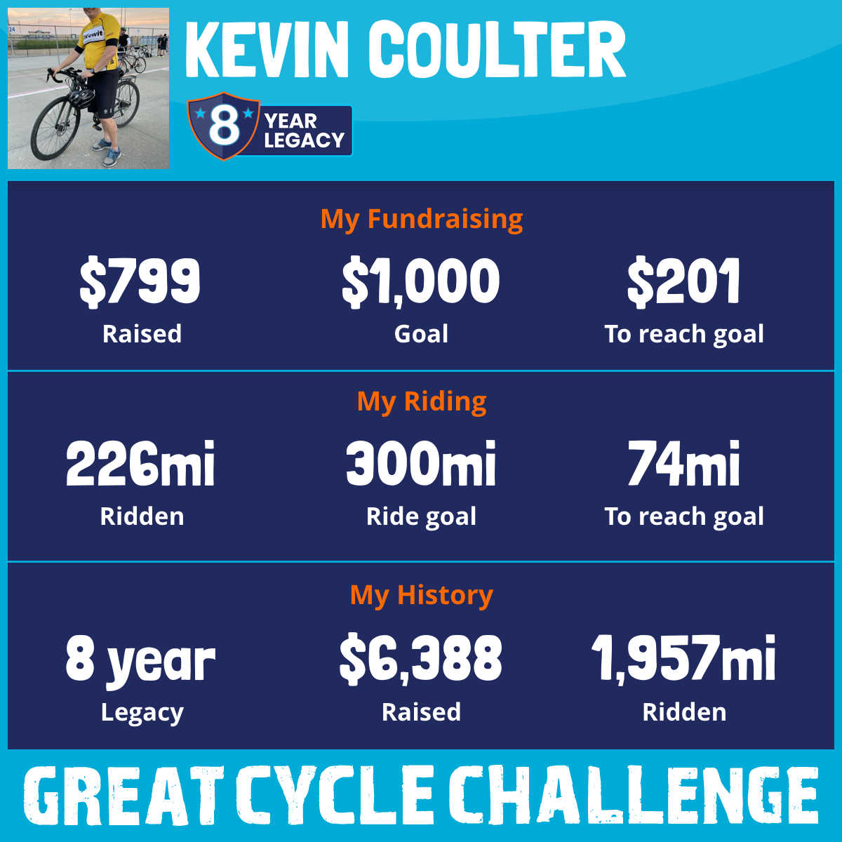 I am riding 300 mi for The Kids. Please sponsor me and support my challenge to fight kids' cancer and save little lives.