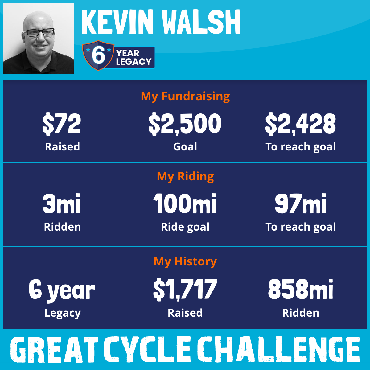 I am riding 100 mi in memory of my myself, Kevin Walsh (that is me. Please sponsor me and support my challenge to fight kids' cancer and save little lives.