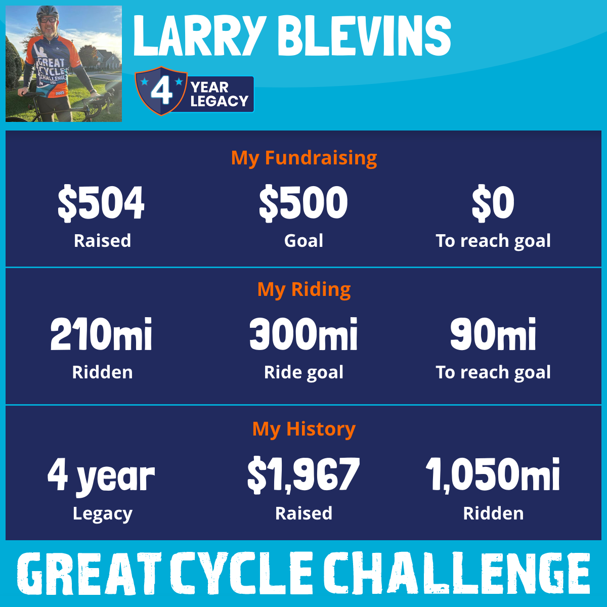This is my 4th year taking part in the Great Cycle Challenge to fight kids' cancer! I have raised the goal in all the previous years and this year I am starting with 300 mi. being my target.