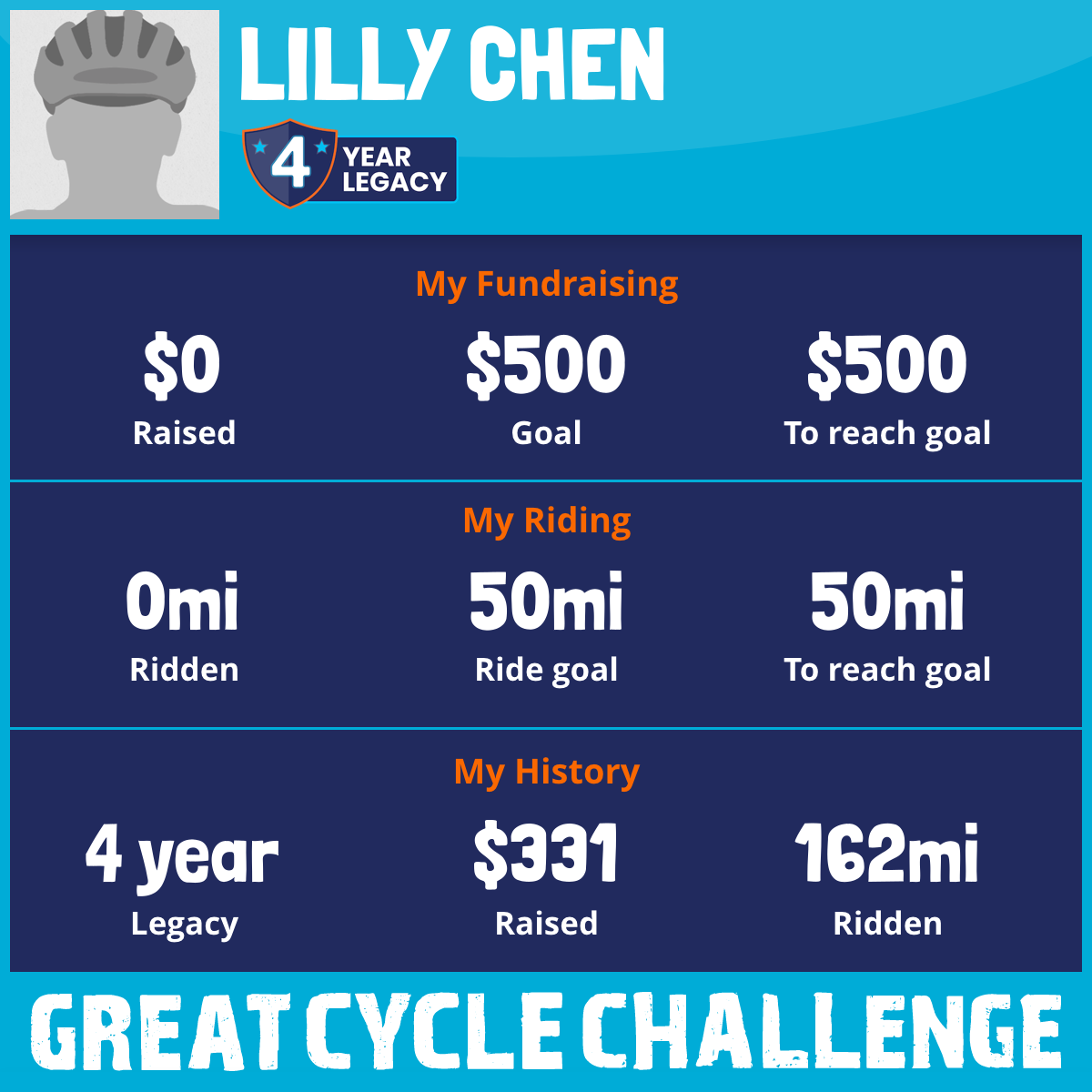 I am riding 50 mi for Lilly. Please sponsor me and support my challenge to fight kids' cancer and save little lives.