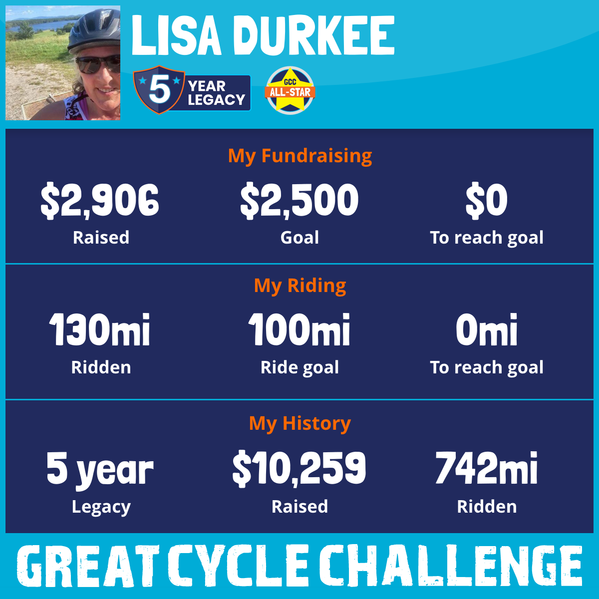 Though this challenge is to support research for children's cancers, I am riding this year in memory of my dear brother-in-law, Lance. His was a valiant fight over seven years, but cancer finally claimed his life. Knowing the entire family's struggle, I am riding in hope of easing the pain for other families and their children. Thank you for your support.