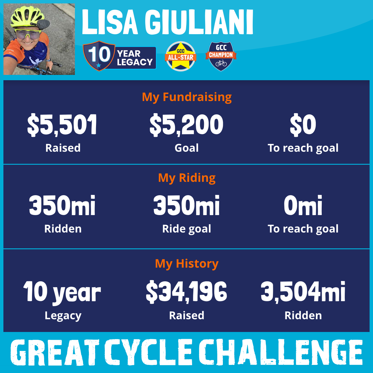 This September, for the 10th year in a row, I am taking part in the Great Cycle Challenge to fight kids' cancer! Great Cycle Challenge started in 2015, and after just 10 years, the event has grown to become one of the biggest cycling events in the United States. In 10 years, our community of riders from all 50 states has ridden a total of 33,817,103 miles, and together we’ve raised $72,646.876 in support of research to develop better treatments and find a cure for childhood cancer. Although I did not participate in 2015, over the past 10 years, I have ridden 3,154 miles, and with the help of family, friends, and neighbors, I have raised $28,818.70 for the Children's Cancer Research Fund. This year, my mileage goal is 350 miles, and my financial goal is $2,000 to reach and surpass $30,000 raised over the 10 years I've been a participant. Will you help me reach my financial goal? I'll take care of the miles and my own donation on Match Day, to be announced.
