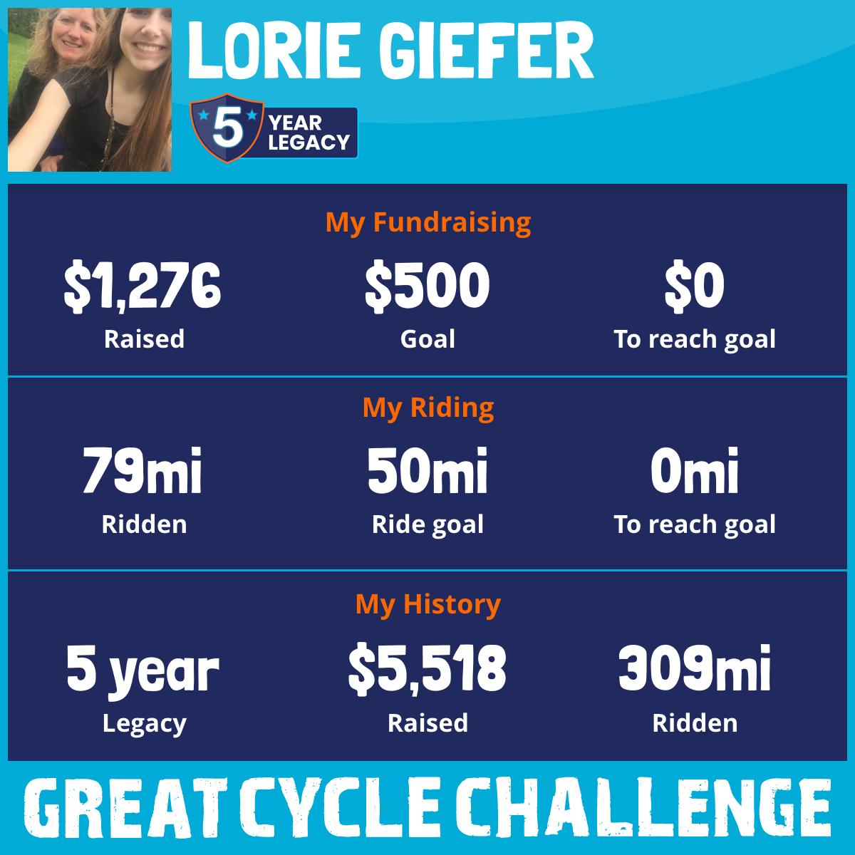 I am riding 50 mi in memory of Heather Giefer. Please sponsor me and support my challenge to fight kids' cancer and save little lives.