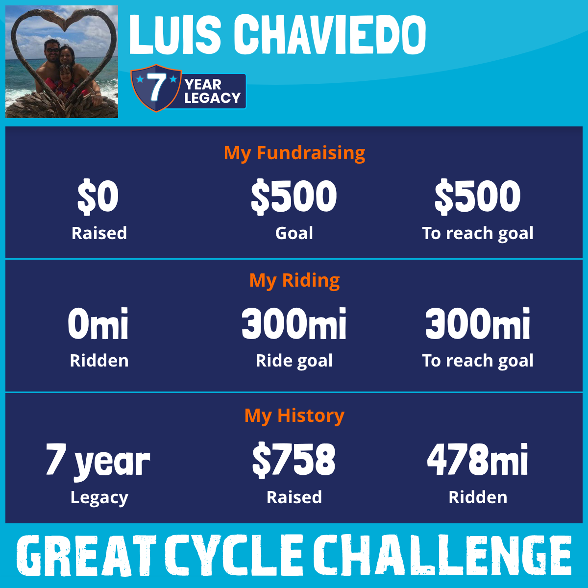 I am riding 300 mi for Luis Chaviedo Senior and Carolina Gutierrez. Please sponsor me and support my challenge to fight kids' cancer and save little lives.