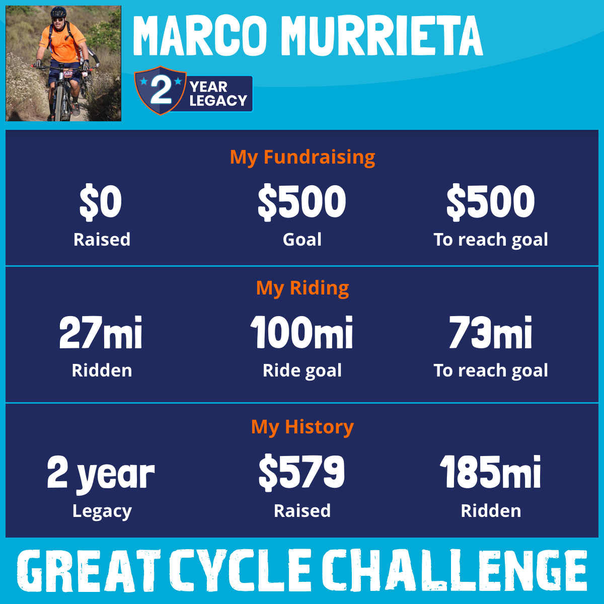 I am riding 100 mi in memory of Marco Antonio Murrieta. Please sponsor me and support my challenge to fight kids' cancer and save little lives.