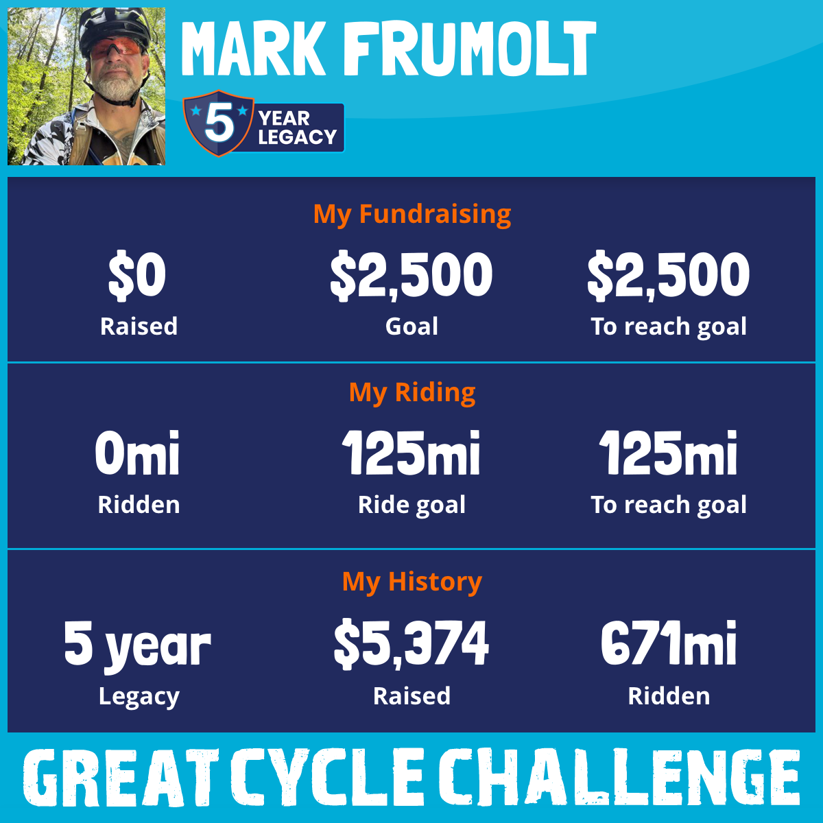 I am riding 125 mi in memory of my mum, Camille Frumolt. Please sponsor me and support my challenge to fight kids' cancer and save little lives.