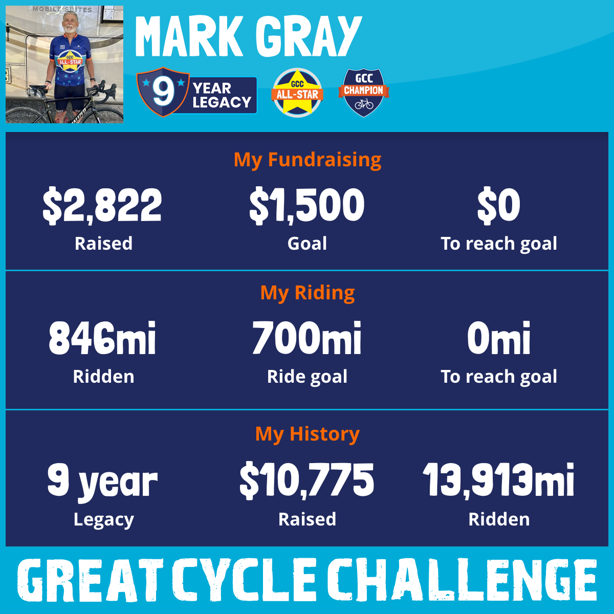 For nine years now I have had the honor of participating in the Great Cycle Challenge which raises money for children’s cancer research. I am again riding this year. The time of riding begins September 1st, but I can receive donations now. Last year I was honored to have had so many who helped and the financial goal was reached even before I started riding. This year I am trying to raise $1500. I will be attempting to ride 700 miles. At 67½ years of age this is a pretty steep goal, but it is such a worthy cause. Would you consider once again helping me reach that goal?