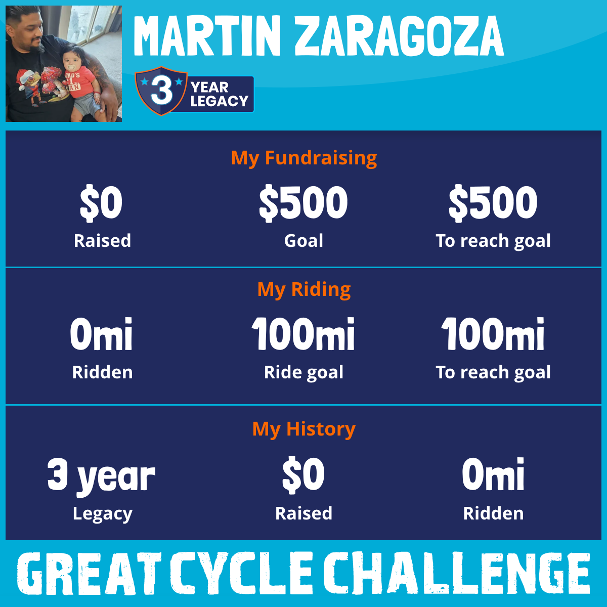 I am riding 100 mi in memory of Abraham Zaragoza. Please sponsor me and support my challenge to fight kids' cancer and save little lives.