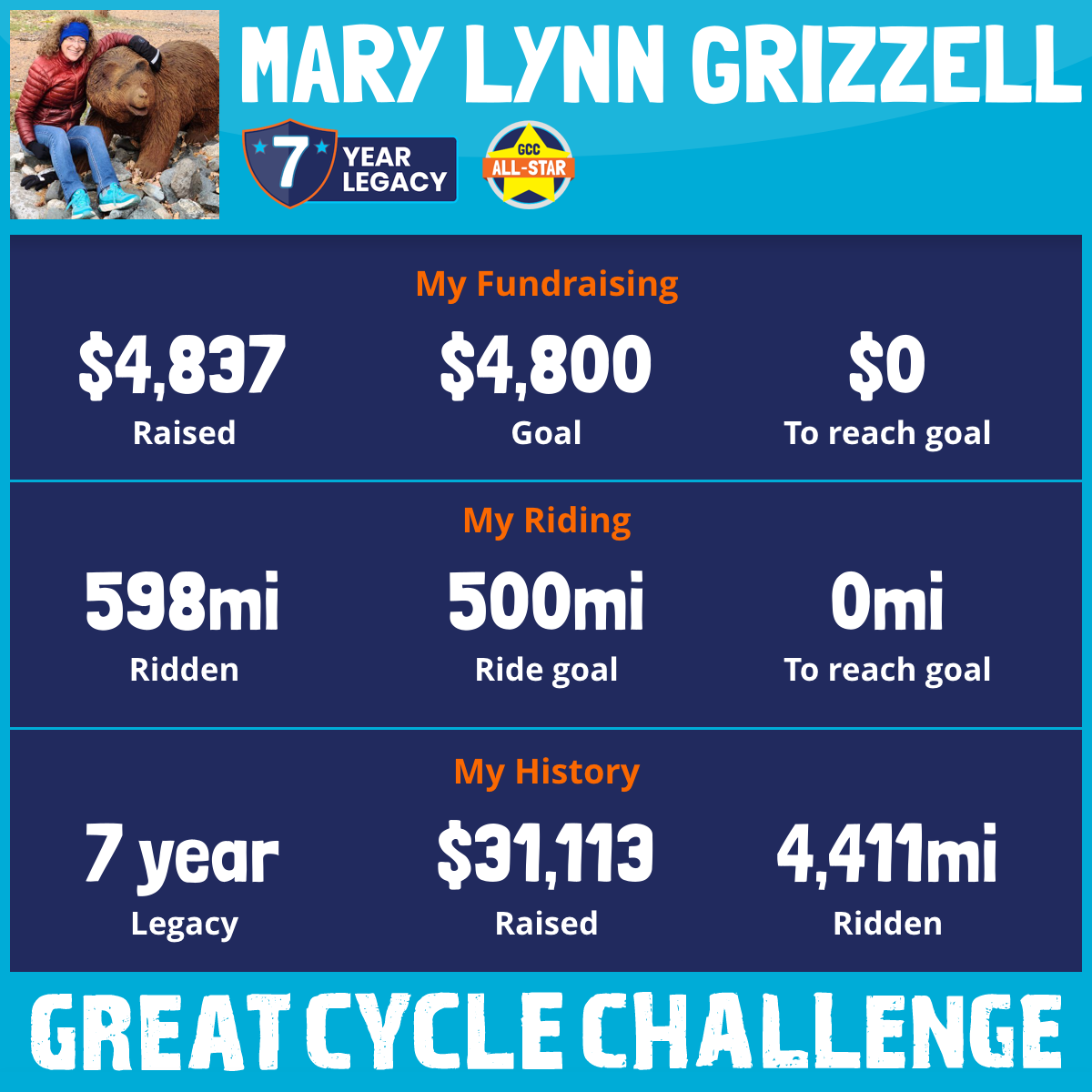This September, will be my seventh year in taking part in the Great Cycle Challenge to fight kids' cancer! Last year with your support, together we raised over $3,600. I believe we can raise $4,500! Over the last six years, we have raised over $26,000. Let's make it over $30,000. Thank you for "riding" with me!