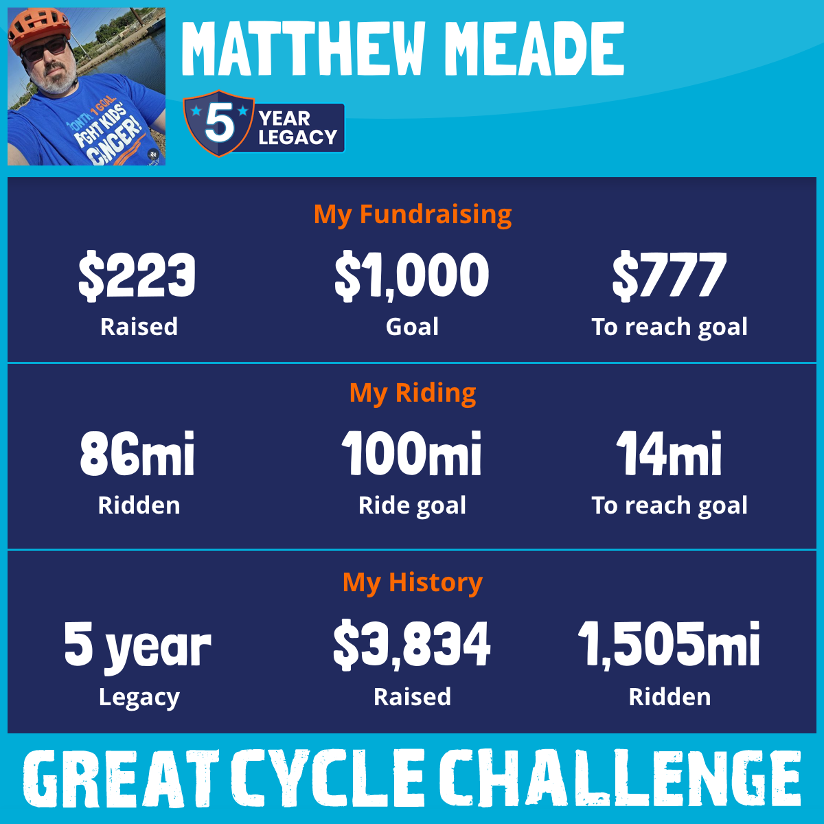 Cancer is such a horrible disease that can take family and friends without much warning. It is so much worse when it attacks kids. I'm doing my best to fight back while remembering those I've lost. God bless you all for helping support my fight against kids' cancer!