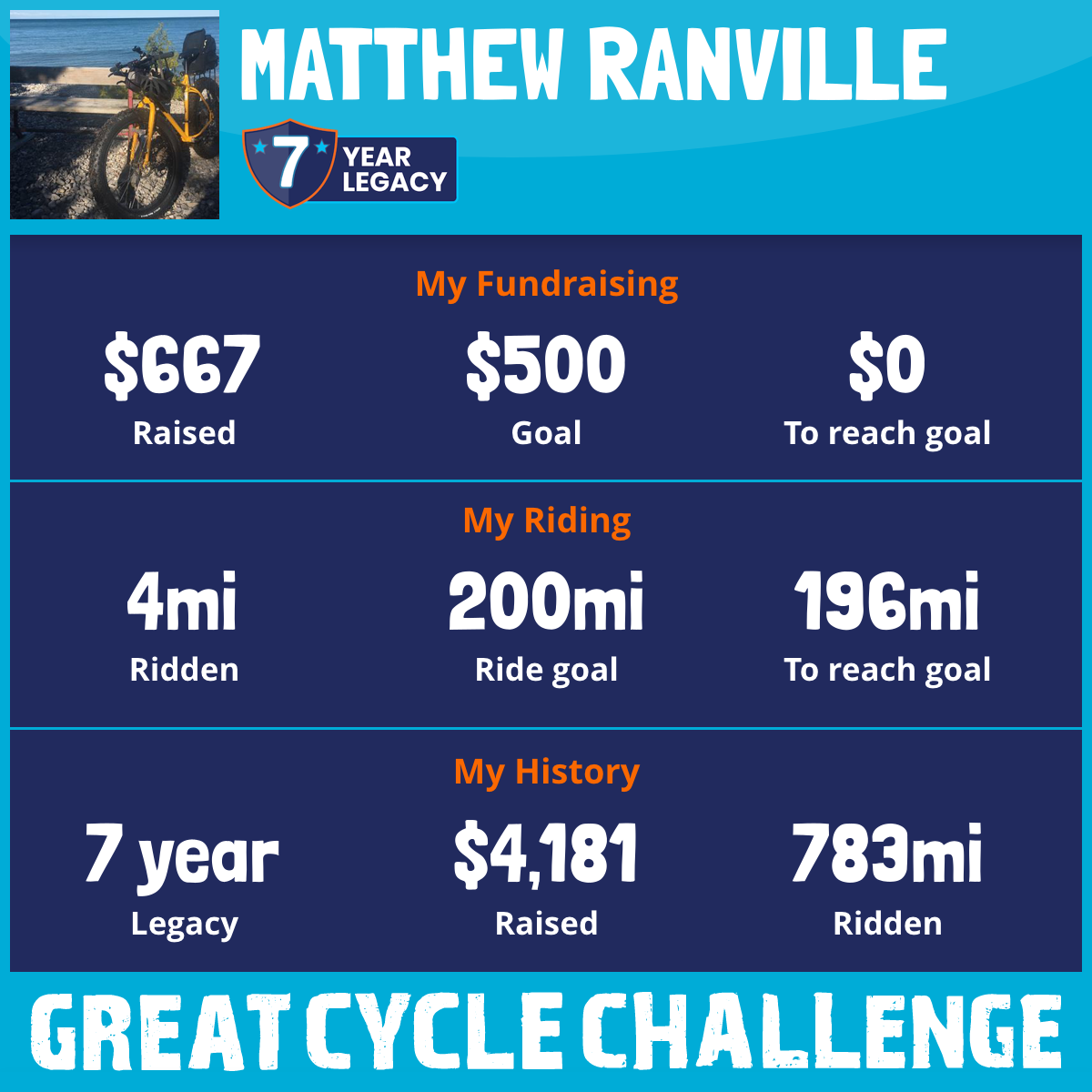 I am raising funds through my challenge to help these kids and support Children's Cancer Research Fund to allow them to continue their work to develop lifesaving treatments and find a cure for childhood cancer. I am riding in memory of my grandmother, who died after a battle with cancer, and for all the friends who died or were impacted by it.