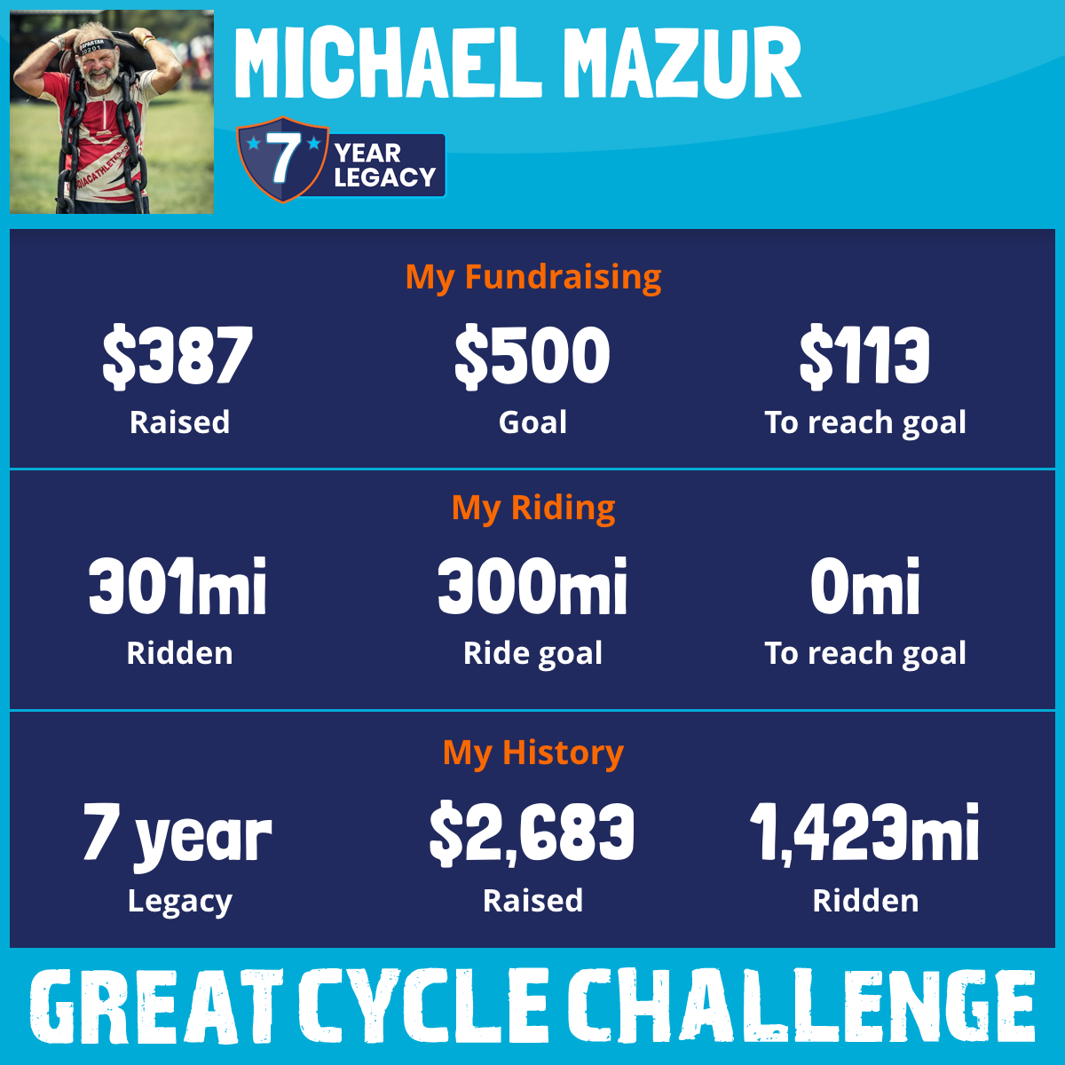 I am riding 400 mi in memory of Barbara Mazur. Please sponsor me and support my challenge to fight kids' cancer and save little lives.