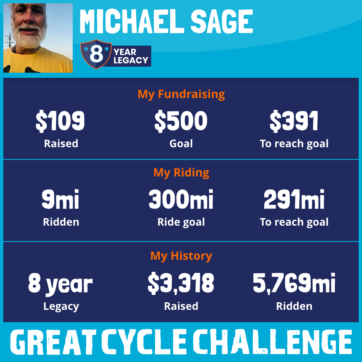 If you want to pledge , go to the website www.greatcyclechallenge.com and hit enter. Once the page pops up, scroll down to DONATE NOW. type in my name Michael Sage , then hit enter. Donate whatever you want.. this should work.