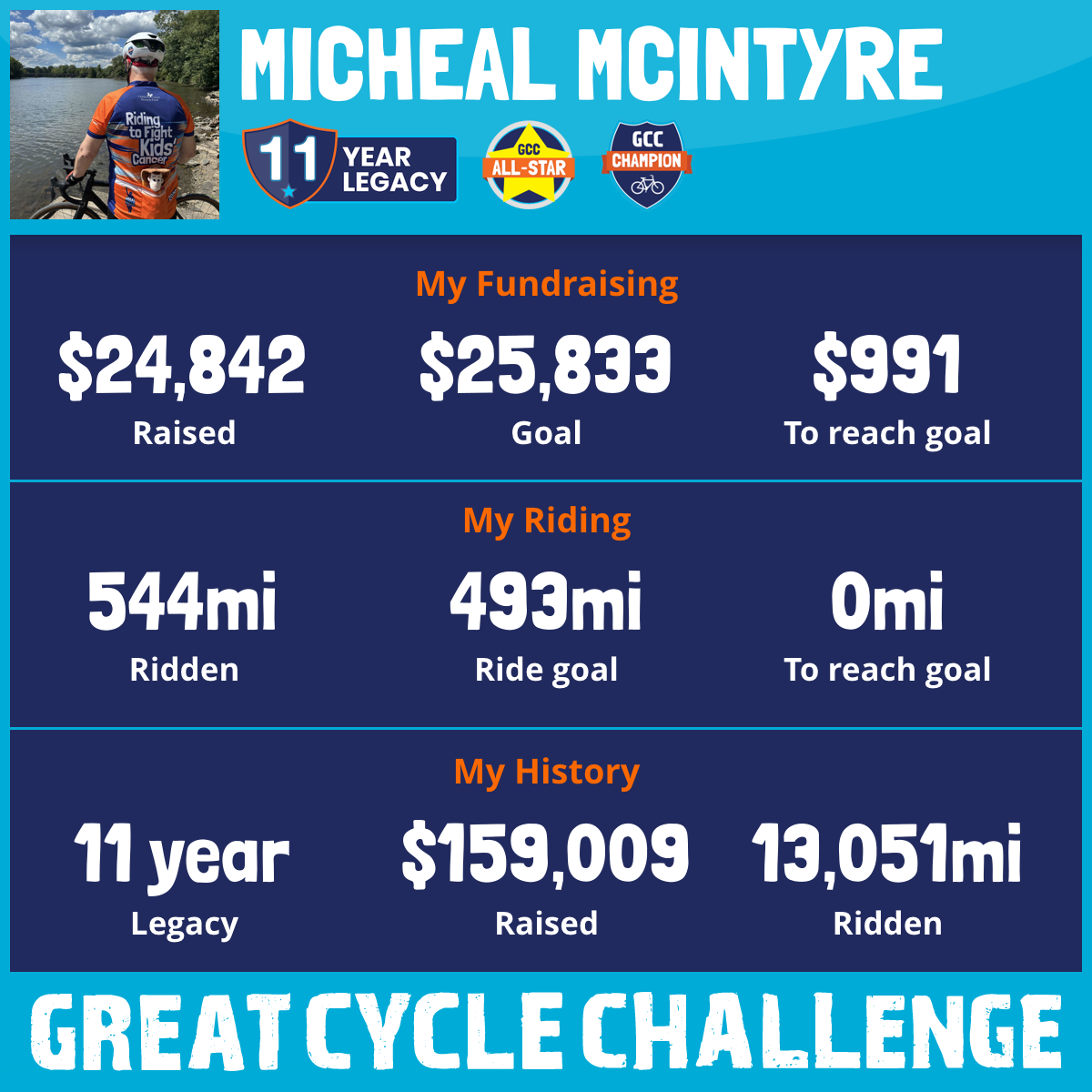 I am participating in my 12th Great Cycle Challenge. The purpose of this event is to raise funds for pediatric cancer research. I have to admit that as I age (I am 75 years young) the pedaling is getting a bit harder each year. Yet, I am fortunate to be able to still ride. There are many kids that will never have the opportunity to reach my age, or even have the chance to ride a bike, as cancer will end their life much too early.