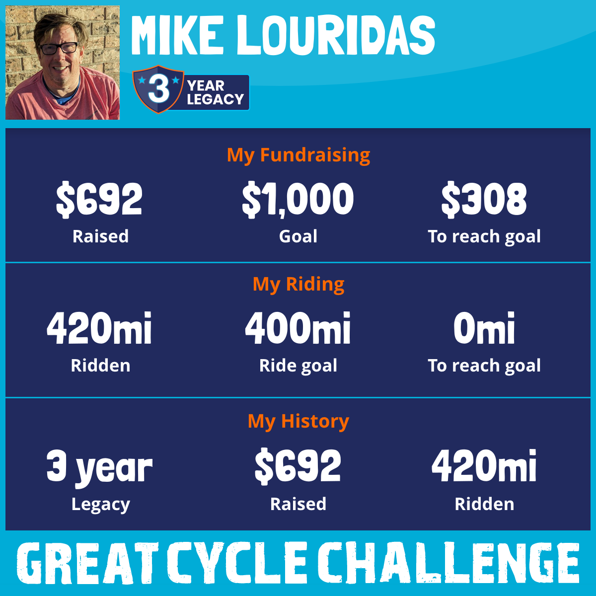 I am riding 400 mi in memory of George Louridas my brother. Please sponsor me and support my challenge to fight kids' cancer and save little lives.
