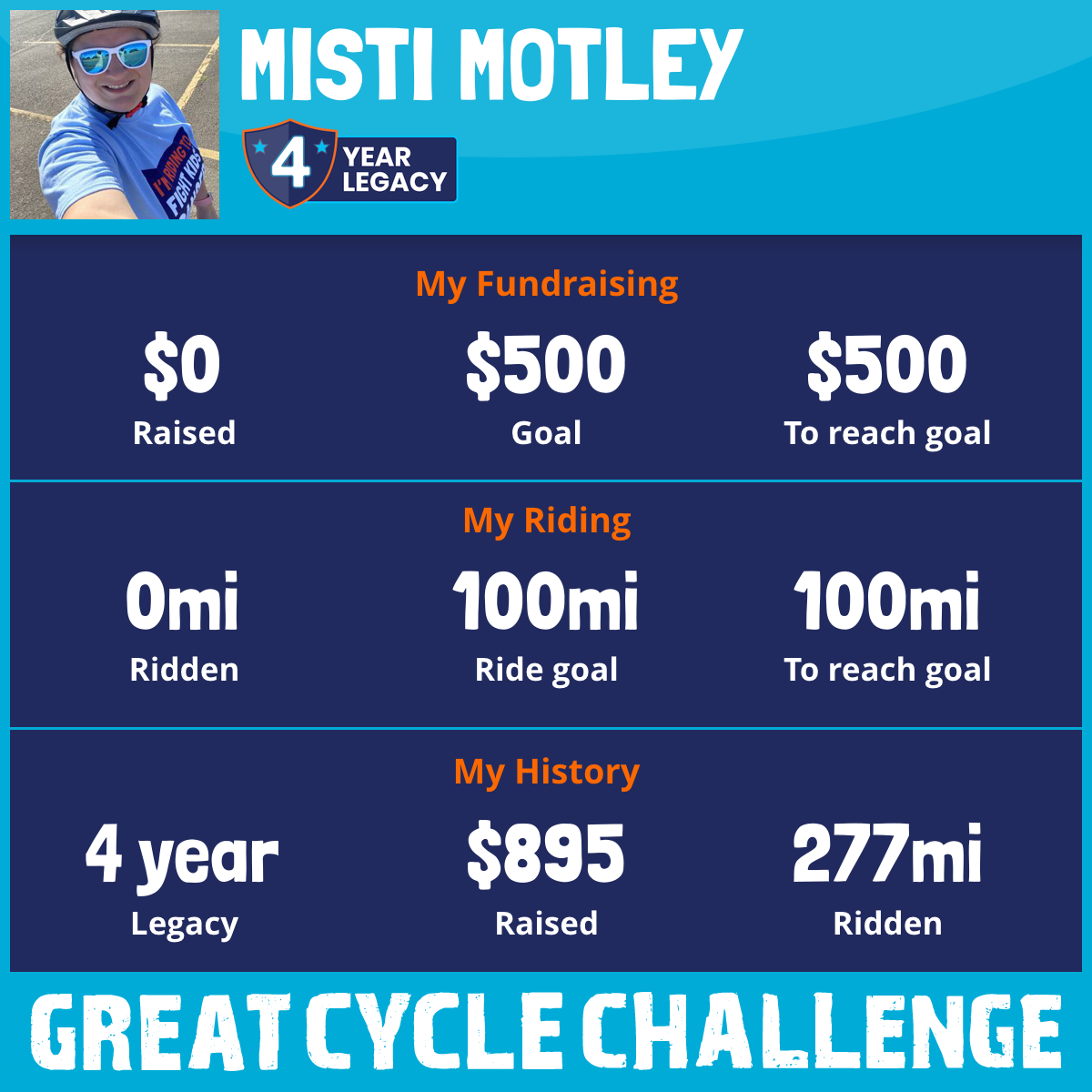 I am riding 100 mi in memory of My sister, a friend and former student.. Please sponsor me and support my challenge to fight kids' cancer and save little lives.