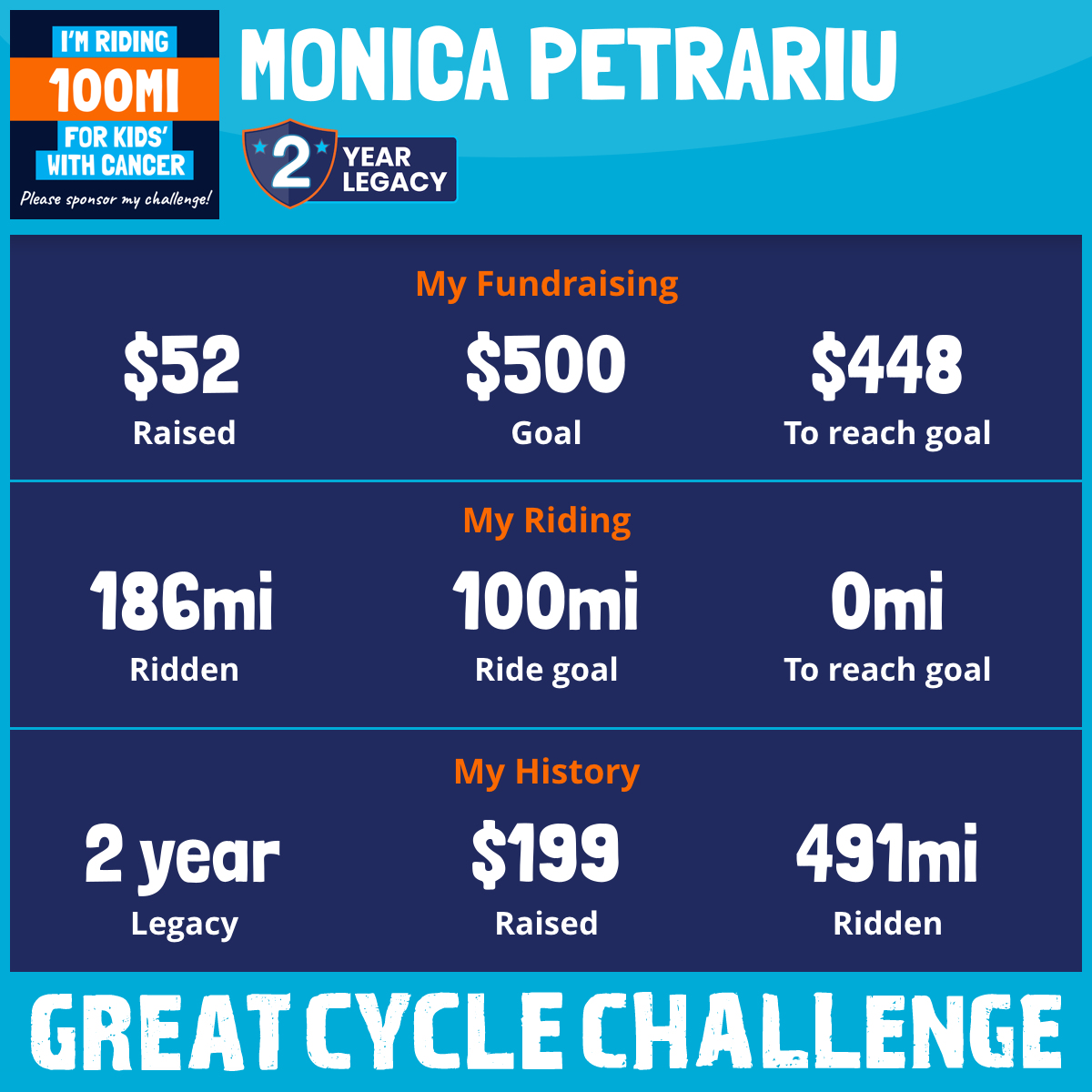 I am riding 100 mi to fight kids' cancer and save little lives. Please sponsor me to support my challenge!