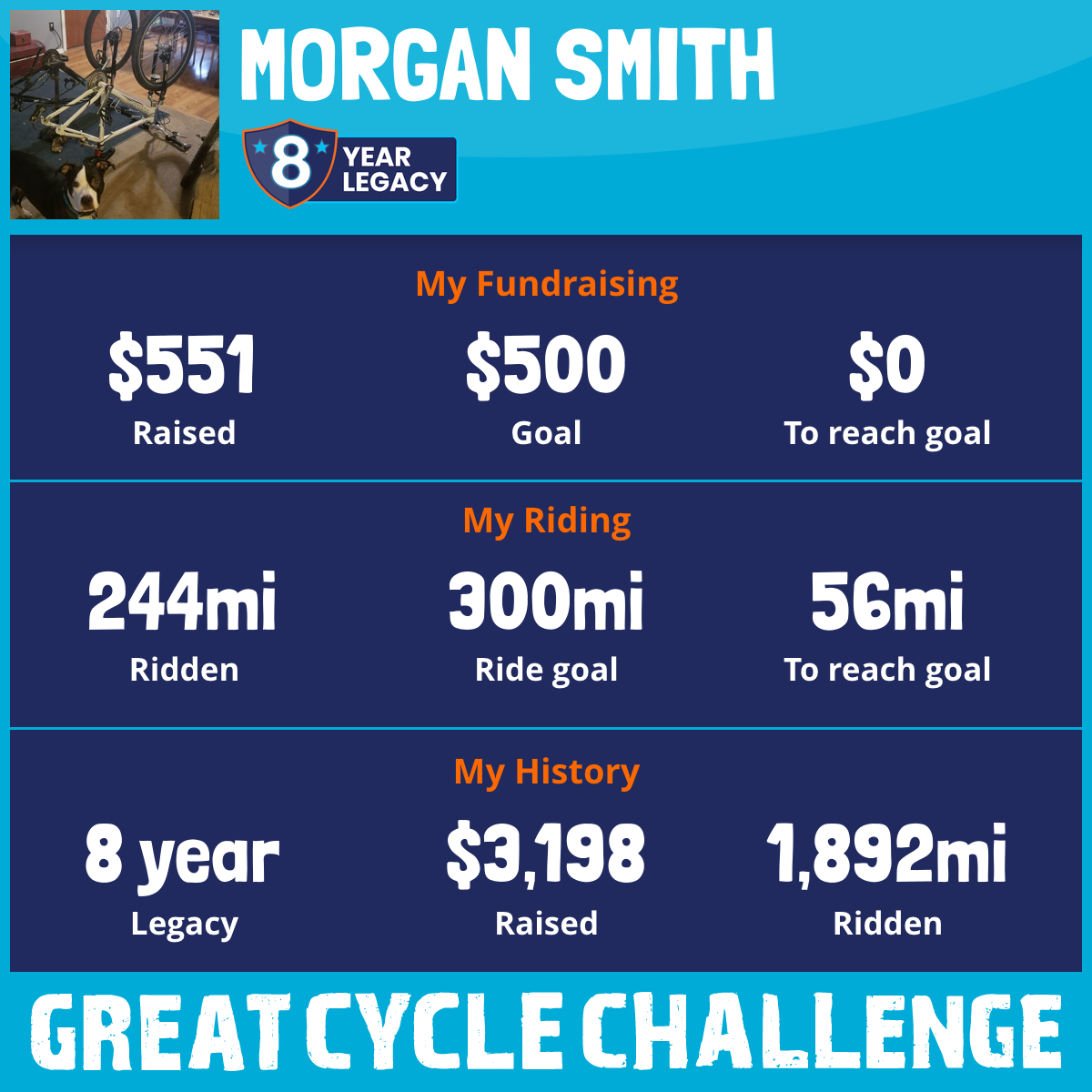 Year 8! It's been an amazing experience to use my favorite pass time to raise money for kids that can't get out there and ride themselves, thank you to anyone taking the time to check out my page, and I highly encourage everyone to get out and ride, if they can, it really is one of the best things ever.