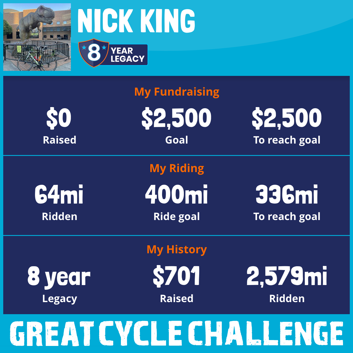 I am riding 400 mi in memory of Grandpa and Grandma King. Please sponsor me and support my challenge to fight kids' cancer and save little lives.