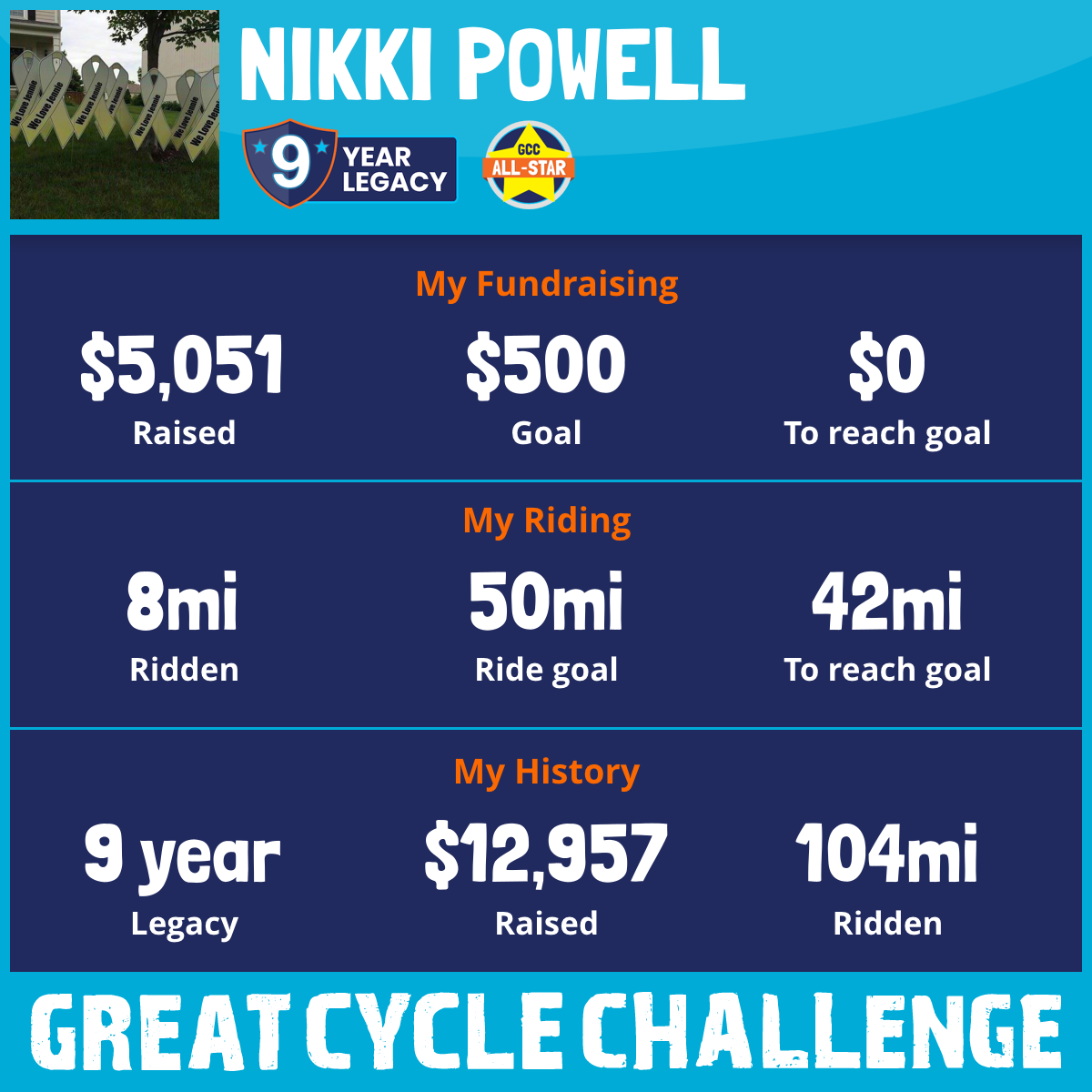 Hey everyone! This is my 9th year in joining T-E-A-M O-S-T-E-O in raising awareness and fundraising in honor of our dear friend, Jennie Nichols. I am asking for your help again this September while we ride (or walk in my case) for those kiddos who are battling cancer and in memory of those who lost their battle. 100% of all donations continue to support the work of Children's Cancer Research Fund. Team Osteo's goal this year is $22,559 and I have absolutely no doubt we will meet that goal! It takes a village to raise this money and Team Osteo appreciates any and all donations. We couldn't do this without all of those family, friends and loved ones who have supported us in the past. Thank you for your consideration!