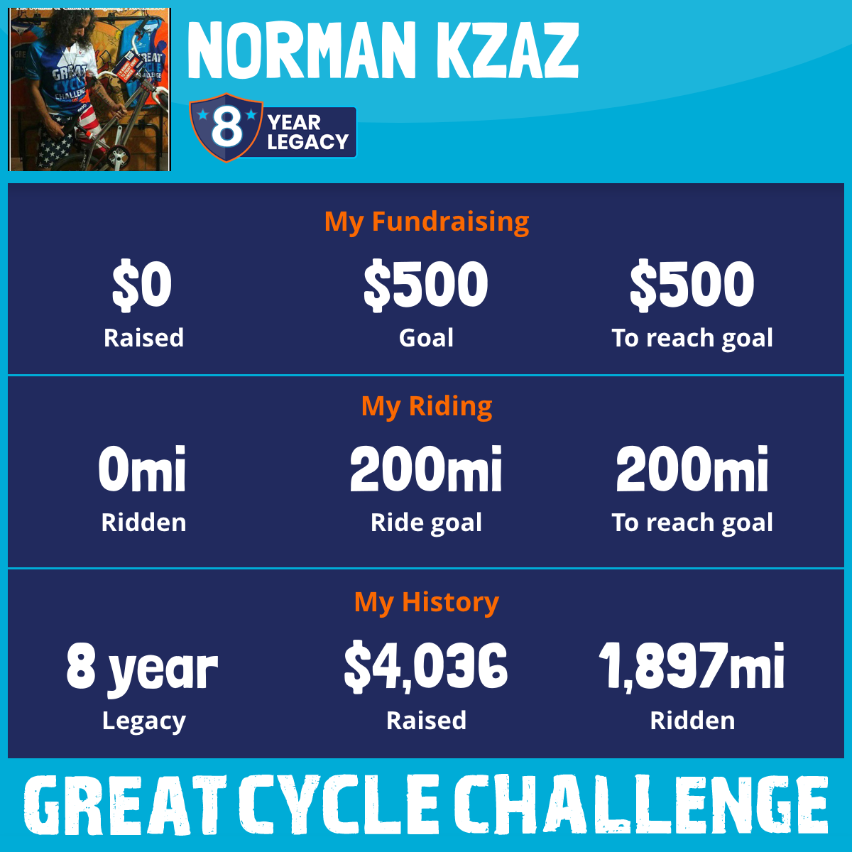 I've signed up for the Great Cycle Challenge making it 7 years in a ROW and will be riding this September to fight kids' cancer! My goal is to pedal over 250 miles throughout the month Riding my 20 inch BMX RACING BIKE.