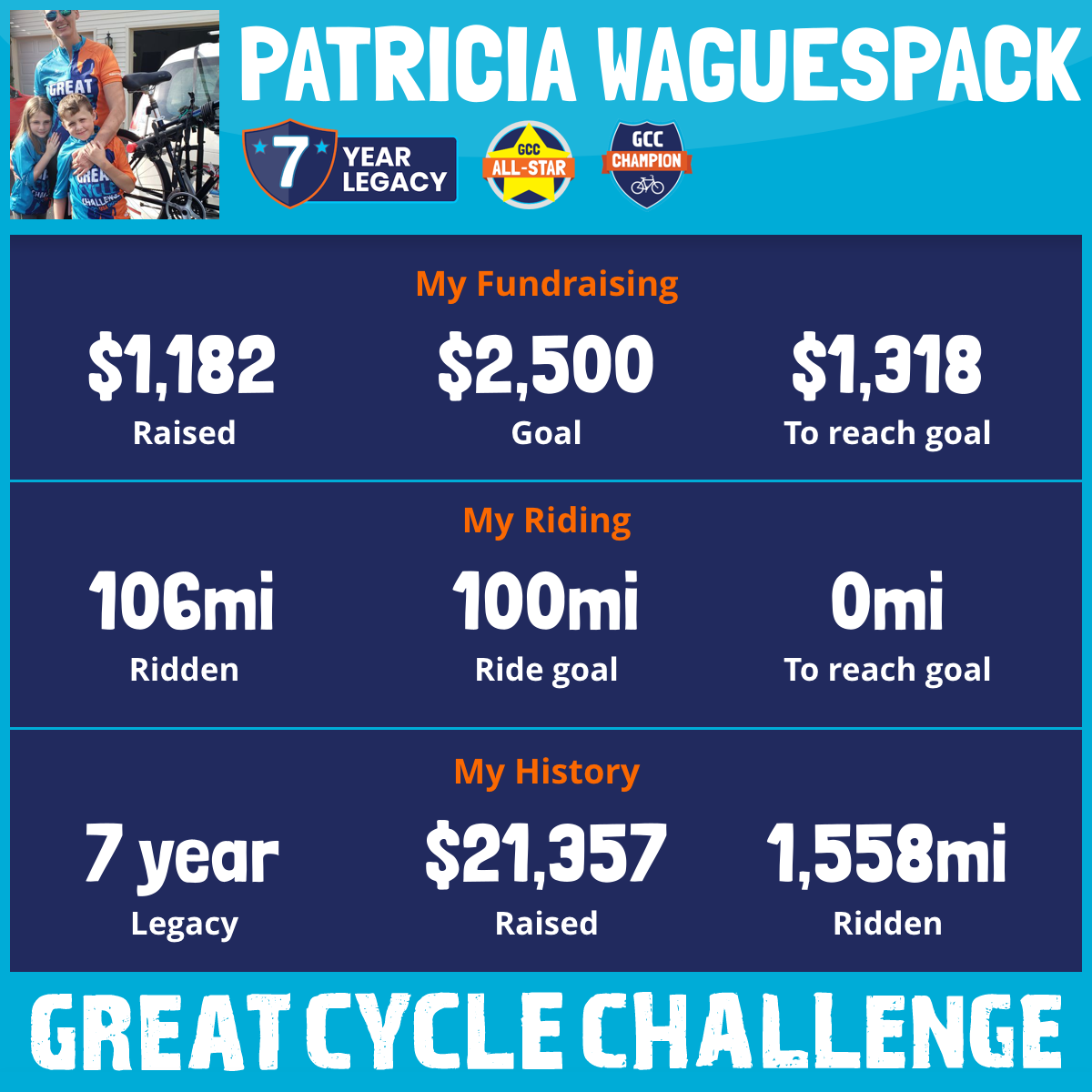 This is my 6th year riding in The Great Cycle Challenge for The Children's Cancer Research Fund and my goal is to reach a lifetime fundraising milestone of $20,000 by raising $3,000 this year.