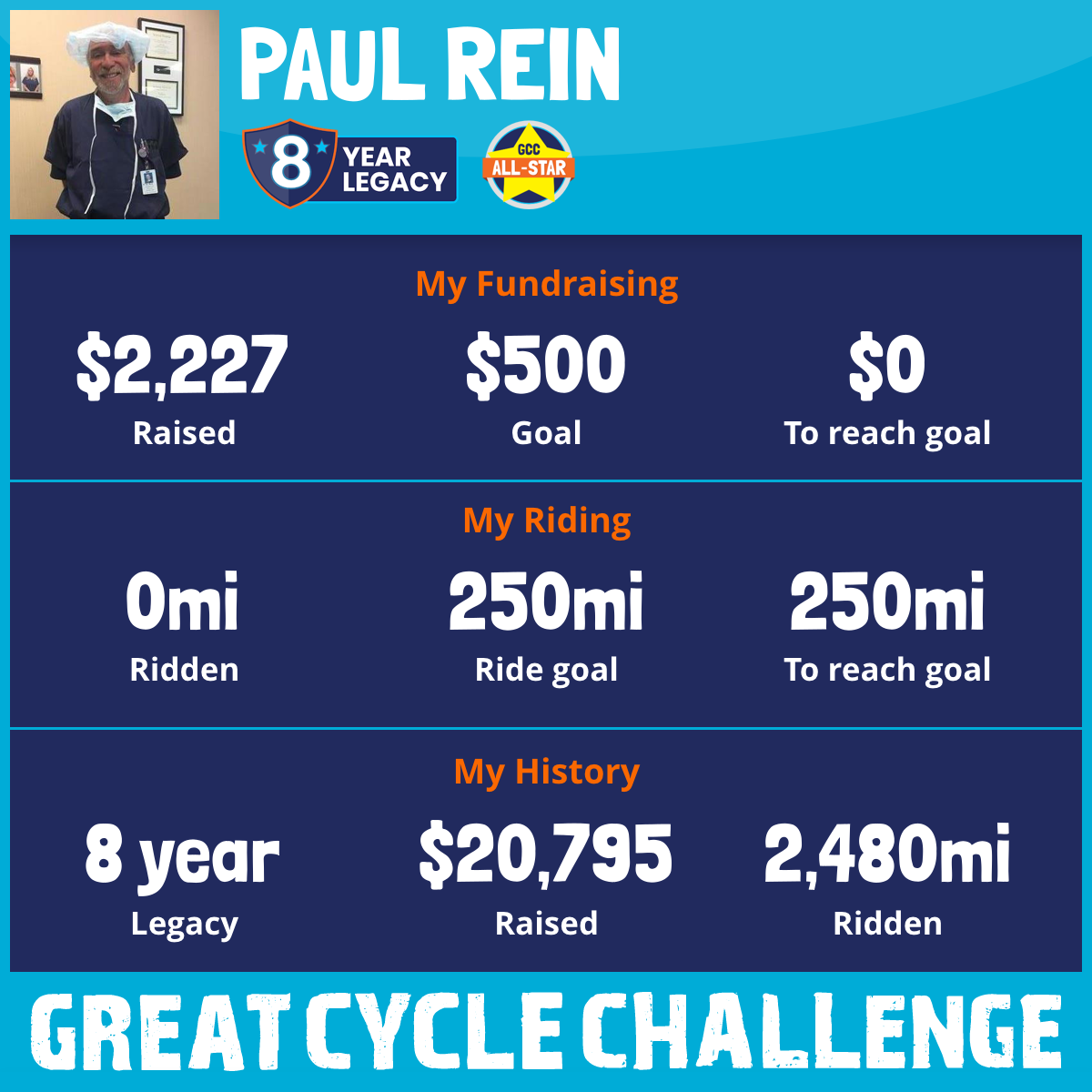 This September, I am taking part in the Great Cycle Challenge to fight kids' cancer! Unfortunately 10 days ago I was doing a training ride for this great event to raise money to help defeat childhood cancer. Suddenly, BOOM I hit a hole in the road and go down. Fortunately a nice out of town couple stopped to help me, called 911 and I was taken to RRMC and have care from a Level 2 trauma center. I had, a broken clavicle requiring surgery. Additionally I had 9 broken ribs all on the right side. Add on multiple contusions and skin injuries requiring a skin vac, and probably surgery on right lower leg for a skin graft. HOWEVER I AM STILL ASKING FOR A DONATION HELP IN THIS FIGHT. SO IF YOU FEEL LIKE YOU CAN A DONATION WOULD BE HIGHLY APPRECIATED.