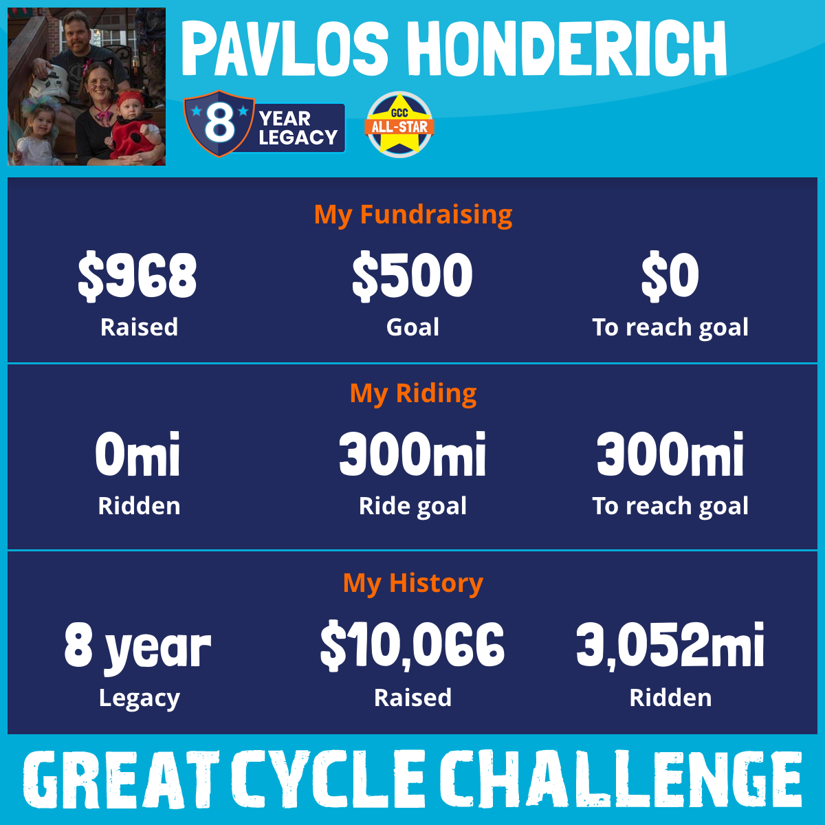 This year marks the 8th year that I've participated in the event going back to 2016. Over the past 7 events I’ve raised $9,100 and ridden over 3,000 miles.