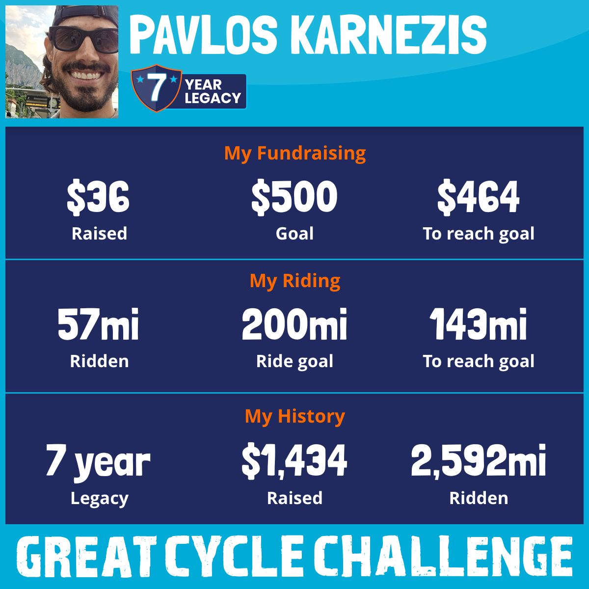 I am riding 200 mi in memory of Kosmas Garderis. Please sponsor me and support my challenge to fight kids' cancer and save little lives.