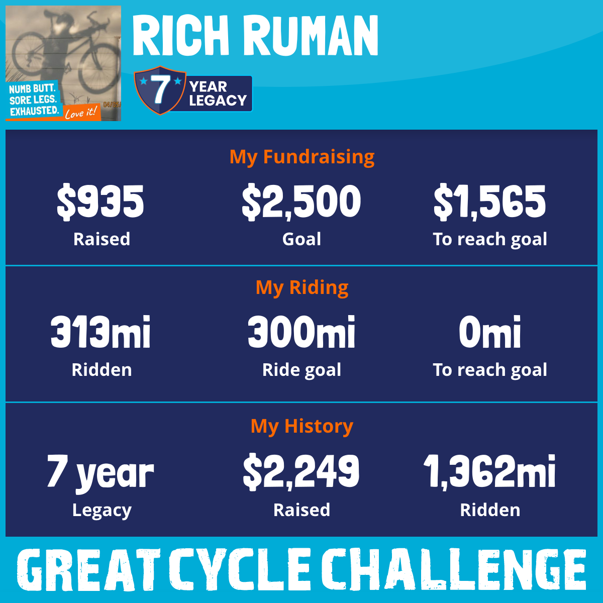 I am riding 300 mi for my Cousin Carol's husband Chuck. Please donate to fund research for an end to kids cancer once and for all.