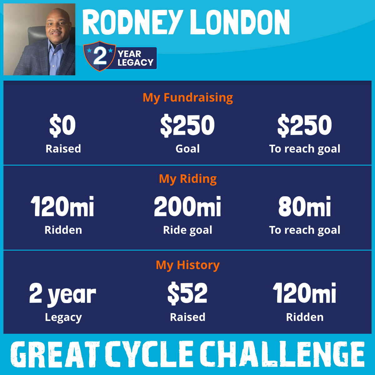 I am riding 200 mi in memory of Rodney London Sr.. Please sponsor me and support my challenge to fight kids' cancer and save little lives.
