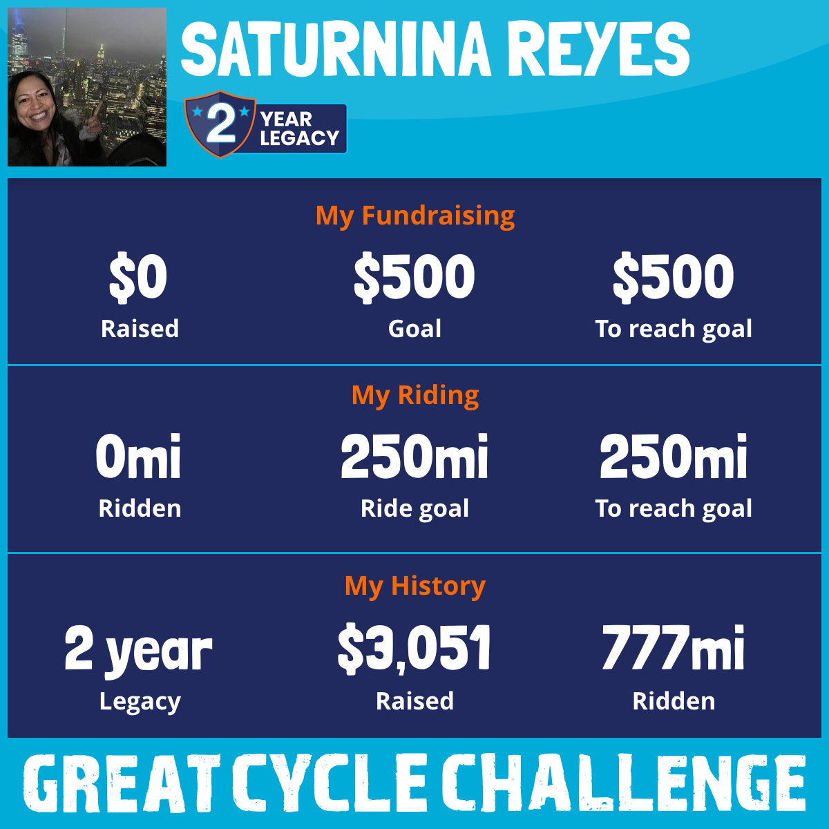 For my mom “Lila Reyes” who is battling cancer for the 5th time and for my friend “Lou Tao” whose life was taken by cancer this year! This September, I am taking part in the Great Cycle Challenge to fight kids' cancer!