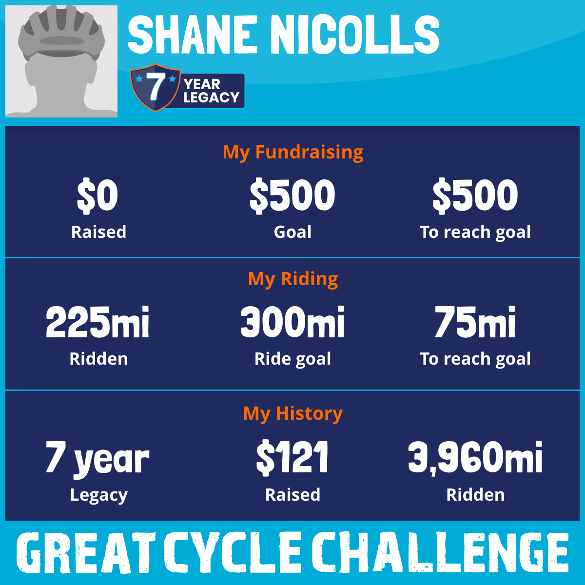 I am riding 300 mi in memory of Dan nicolls. Please sponsor me and support my challenge to fight kids' cancer and save little lives.
