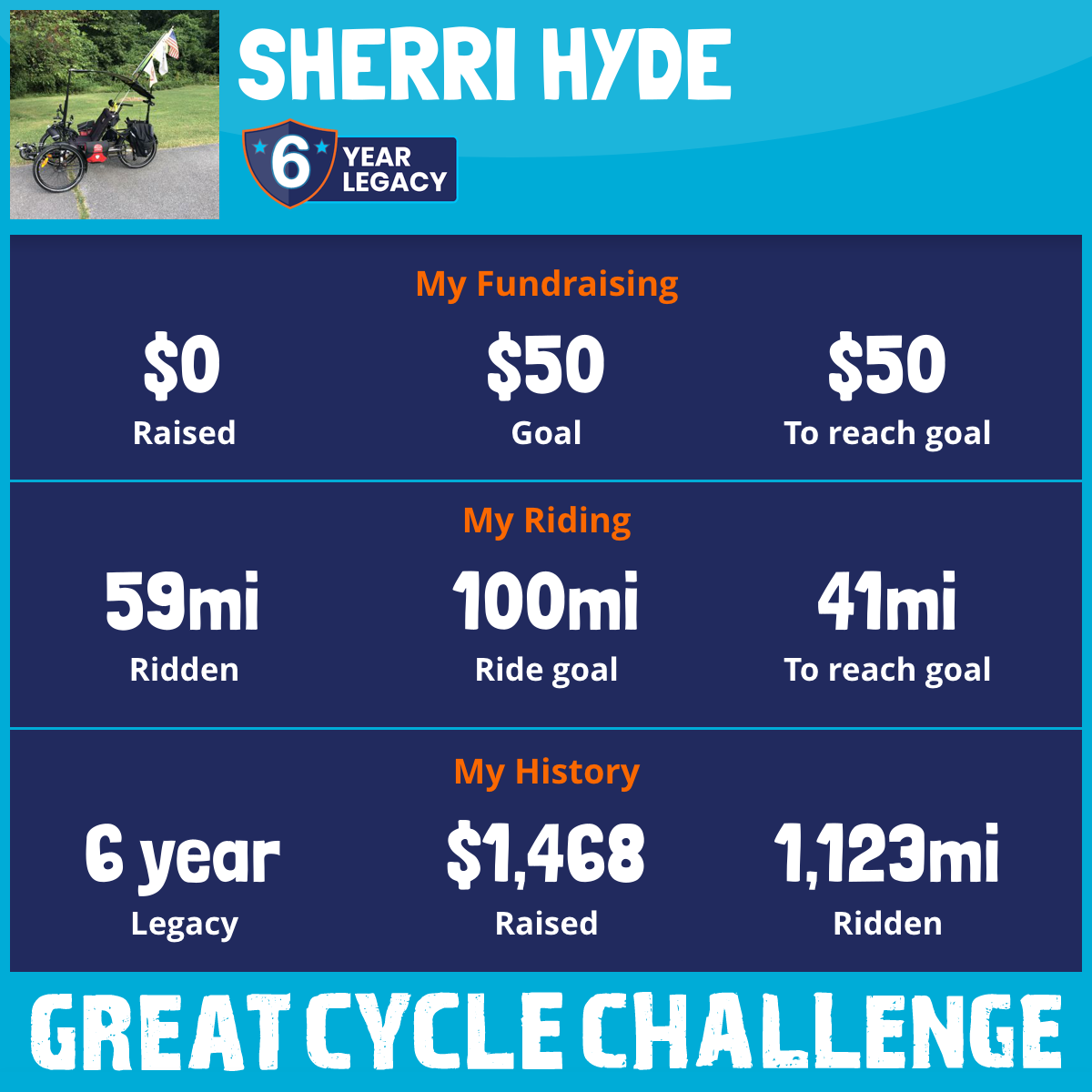 I’ve ridden overall 657 miles and raised $1,313 overall this will be my sixth year of riding in the challenge.