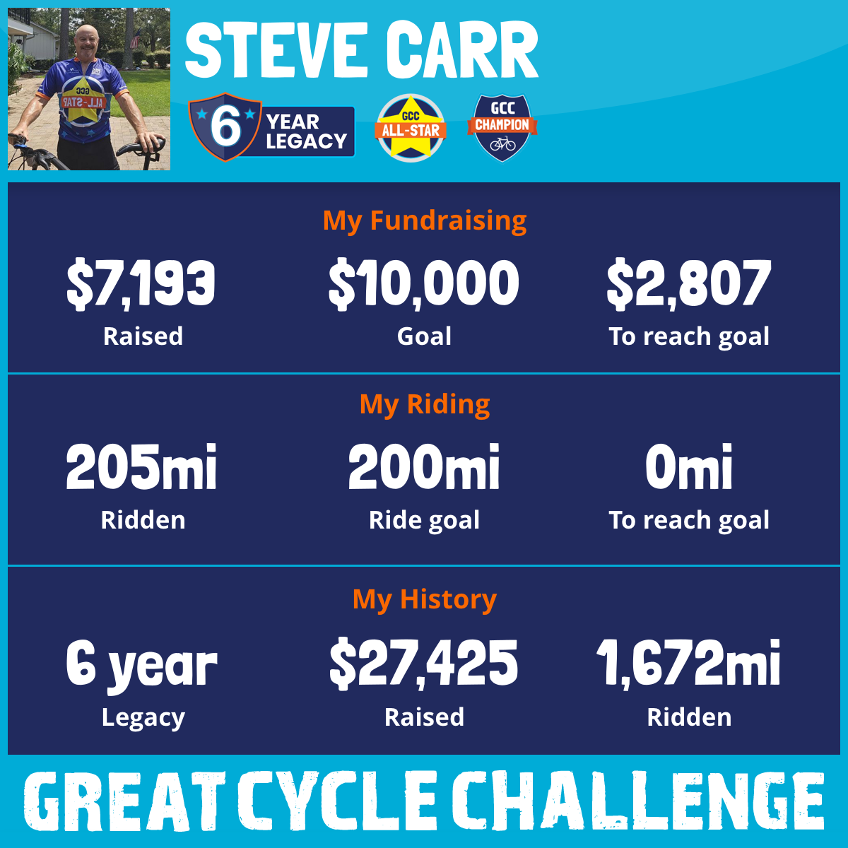 This September, it will be year 7 in taking part in the Great Cycle Challenge to fight kids' cancer! Many of you were key to my 2020 through 2025 goals. Thank you all very, very much!! There is still much work to be done. We have raised over $27,000 because of your generosity!