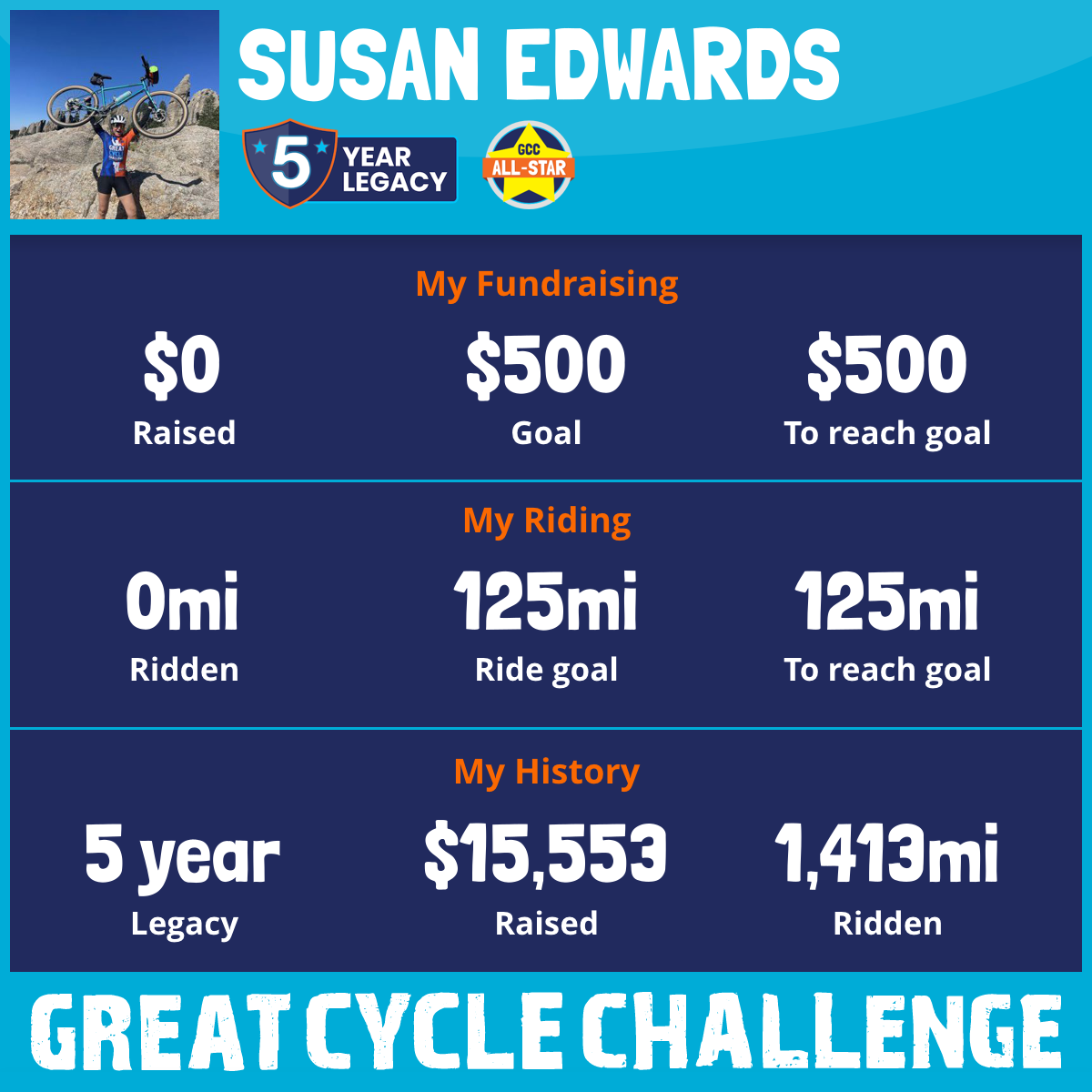 September 2021 in celebration of my 50th birthday I participated in my first Great Cycle Challenge. My initial goal to raise $500 and ride 500 miles turned into a passion to KICK CANCERS BUTT!