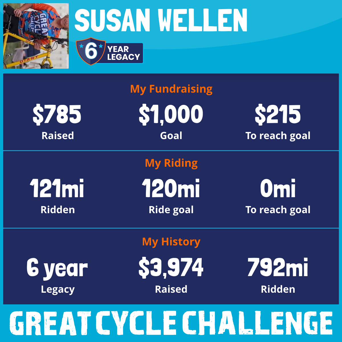 This will be my 6th year participating in the great cycle challenge for kids cancer. Unfortunately I lost a good friend Linda k Pope and will be riding in her memory again. Also riding for my parents who both died from Cancer, my friend Kenny Lankford who also died from Cancer... Riding for all the kids who are fighting and those who lost their lives to cancer. I would like to reach my goal of $1000+ this year.