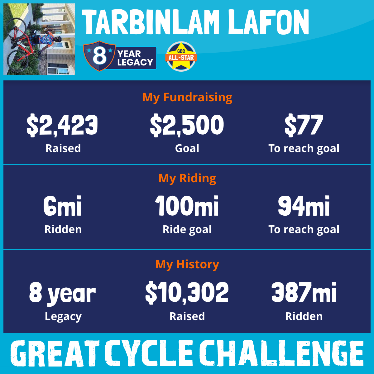 I am riding 100 mi in memory of For all the members of the Lafon, Nguni, Che and friends' families who've been affected by cancer. Please sponsor me and support my challenge to fight kids' cancer and save little lives.