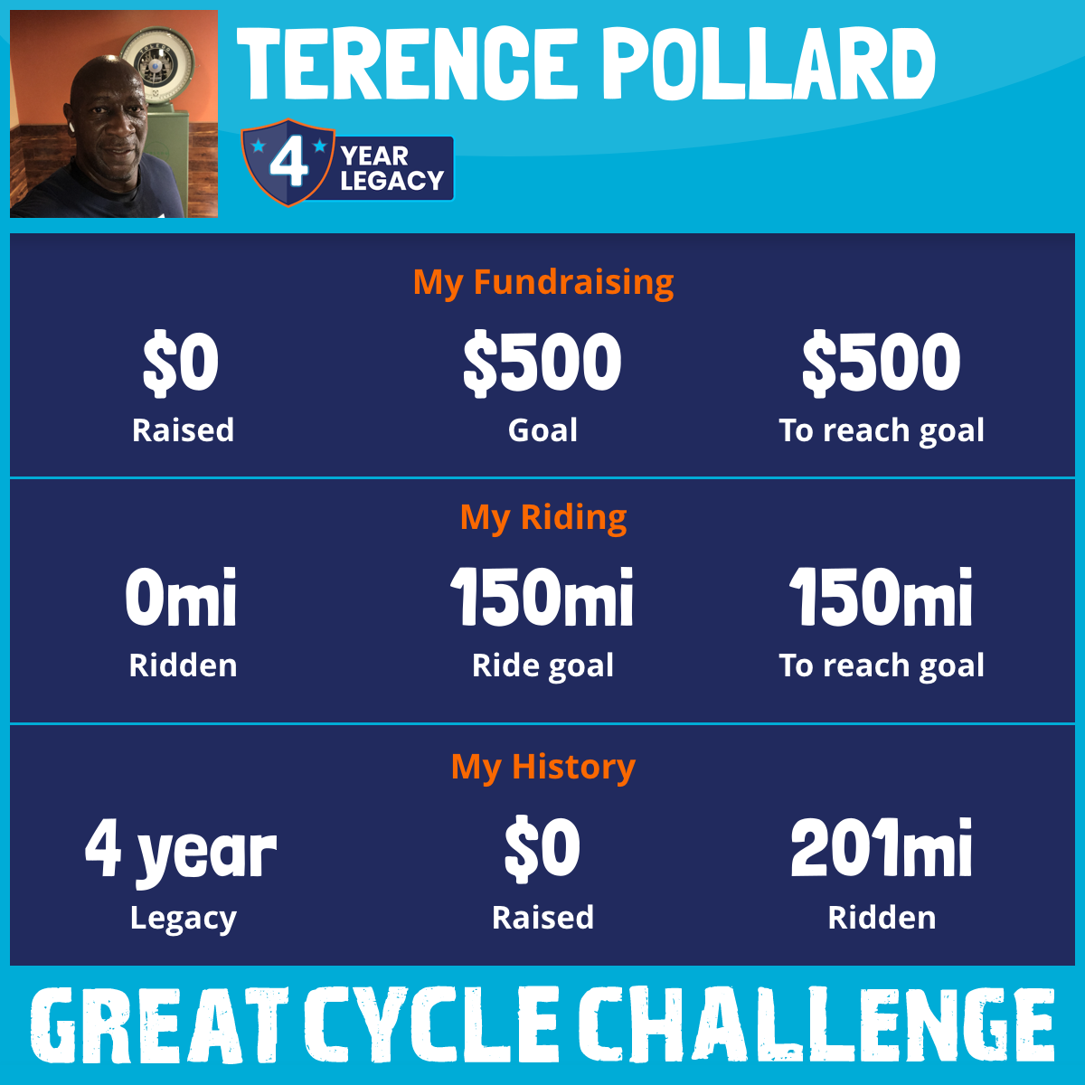 I am riding 150 mi for Terence ( I Am A Cancer Survivor) riding for myself. Please sponsor me and support my challenge to fight kids' cancer and save little lives.