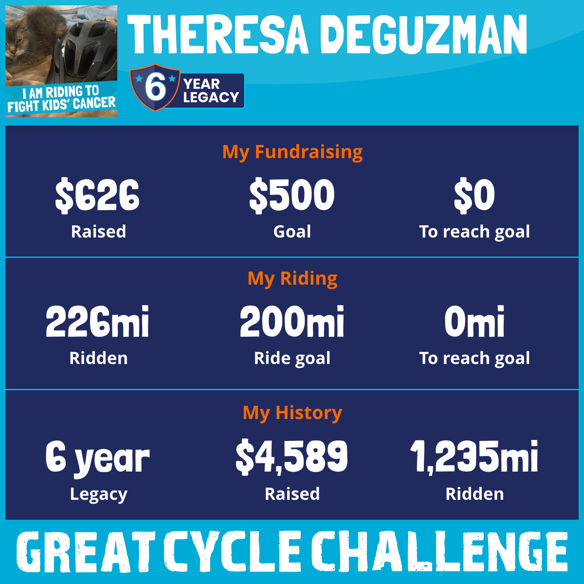 Although I got a late start and had to reduce my riding goal due to some minor issues, I am still committed to riding 200 miles this September for the cause. Please support me by making a donation to give these kids the brighter futures they deserve.