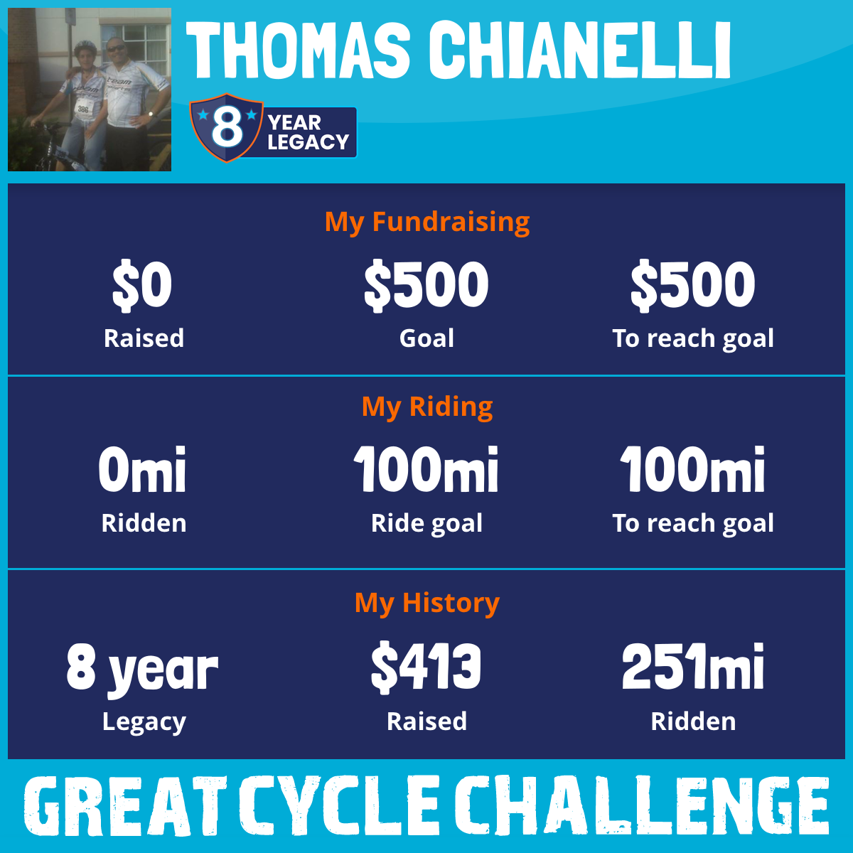 I am riding 100 mi in memory of Frank Chianelli. Please sponsor me and support my challenge to fight kids' cancer and save little lives.