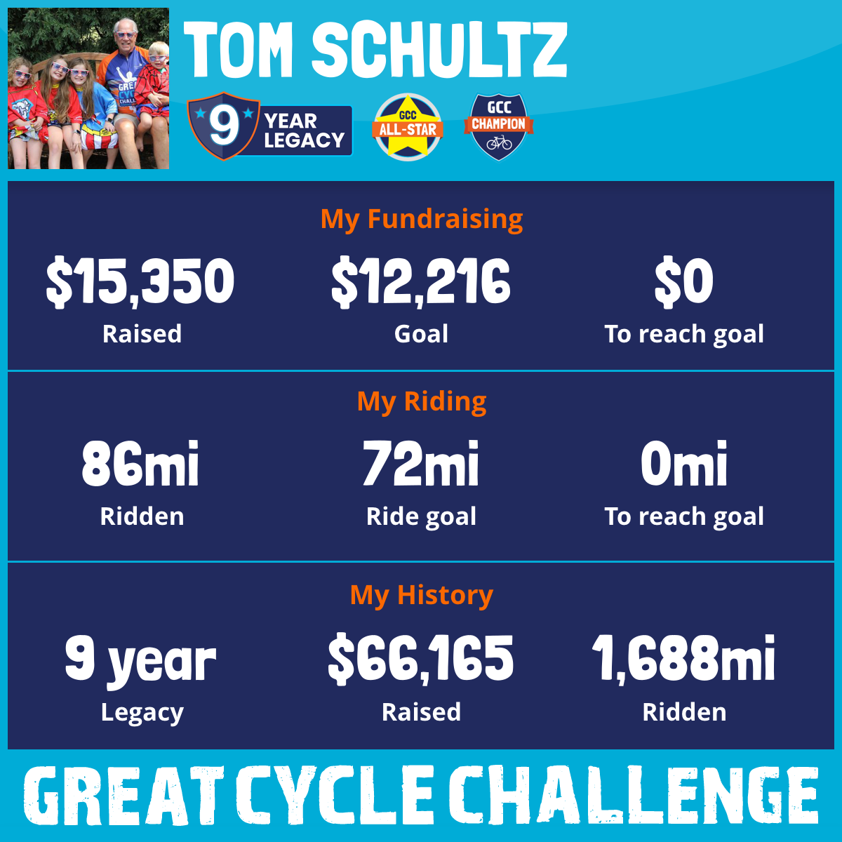 As I complete my ninth year in taking part in this challenge, I reflect on how we have raised awareness, prayers, and funds to fight kids’ cancer while allowing me to “get on my bike and ride.” I am blessed to have so many wonderful and amazing friends, family, and supporters! Yes, $66k in nine years.