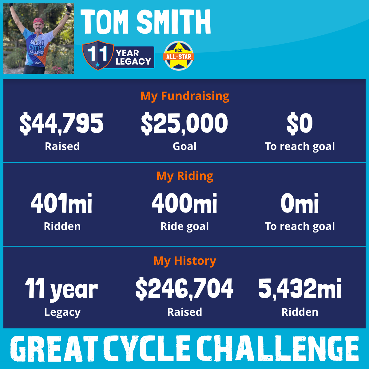 During this fundraiser in the last 10 years, I've ridden over 5,000 miles and, through your generous support, raised over $200,000.00. The overall fundraiser has raised over $80,000,000.00. Thanks in advance for your amazing support.