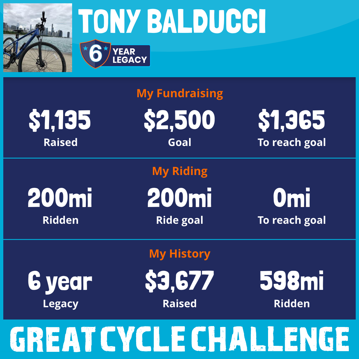 Year 6 of The Great Bycle Challenge. I spent a lot of time in and out of hospitals as a kid. No child should have to fight cancer, but the sad truth is that they do. I found this challenge 6 years ago, and I ride in memory of my Grandmother, who passed away from cancer. I ride to do something good for those who need it. By riding my bike, I can help bring awareness and raise money for this amazing cause. Well then, that's what I have to do.