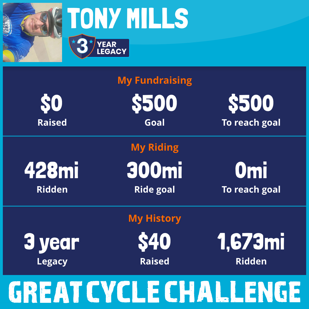 I am riding 300 mi for Tonny mills. Please sponsor me and support my challenge to fight kids' cancer and save little lives.